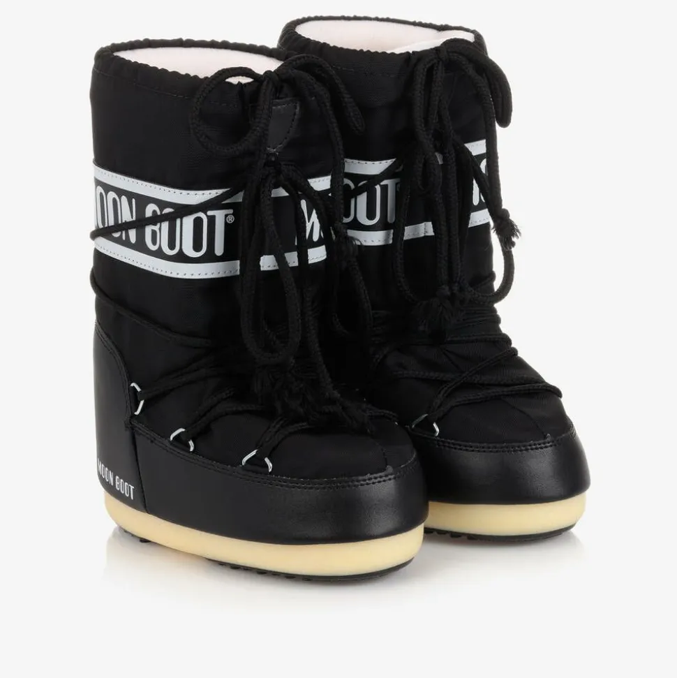Black snow boots for boys and girls by Moon Boot, with a white logo print panel for a bold, branded look. Heavily padded and ultra resistant in the original style, they feature a two-tone thermoplastic sole with little suction pads at the bottom for improved grip. They have faux leather trims, a stylish lace-up look and a drawstring ties on the ankles to lock in warmth. The technological foam lining will feel snug at first but will mould to the size and shape of the foot after a few hours of wear.