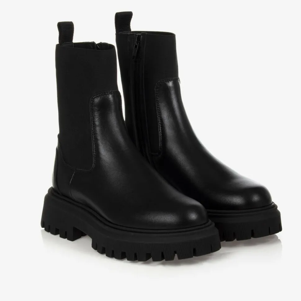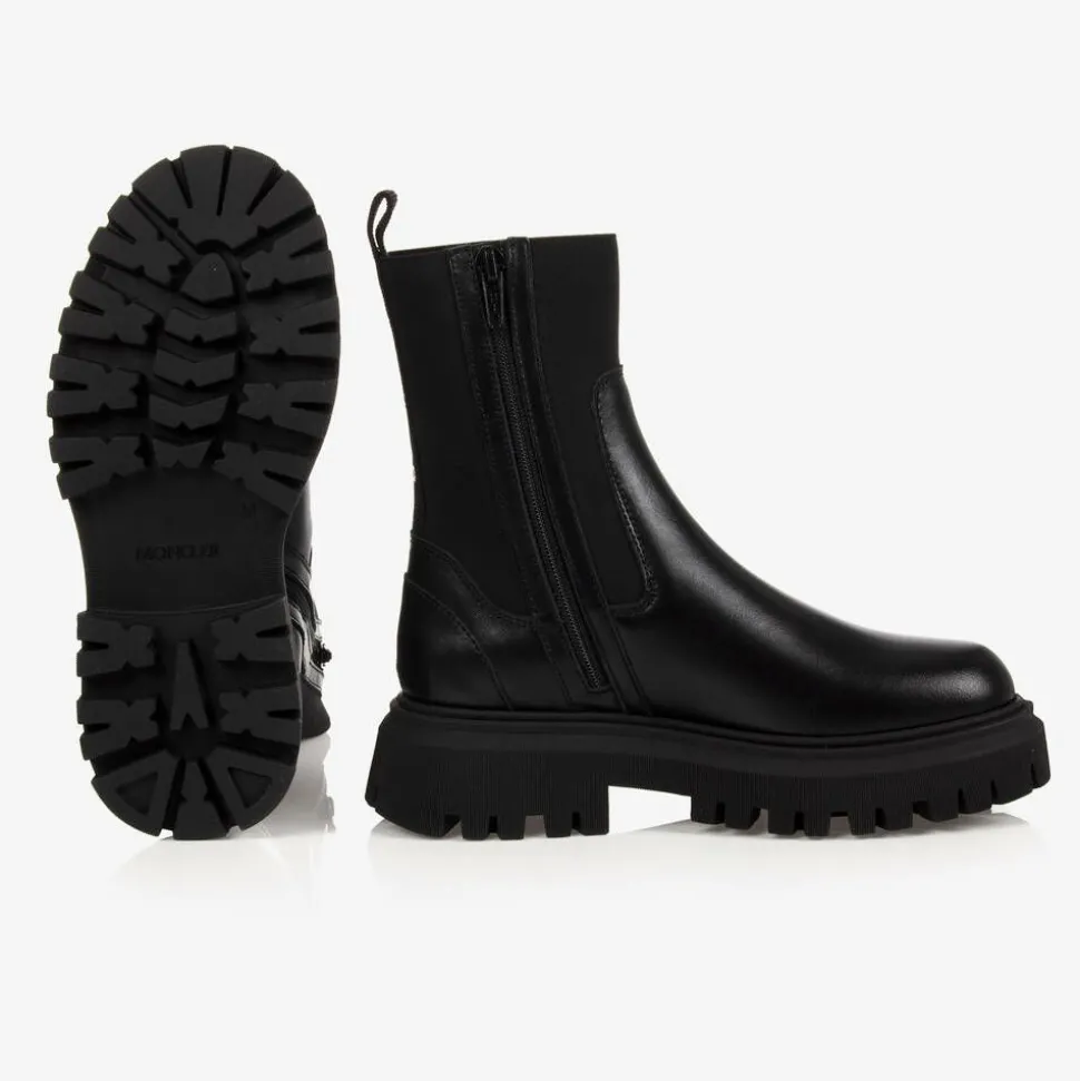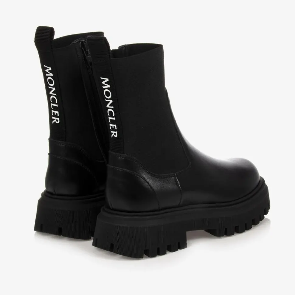 Chunky, black leather Chelsea boots for girls and boys by Moncler Enfant. These versatile, stylish boots have a thick, rubber platform heel and a bold logo print embossed on the back. They have an elasticated panel on the ankle, side zip fastening, and an elasticated pull tab on the back, making them easier to slip on.