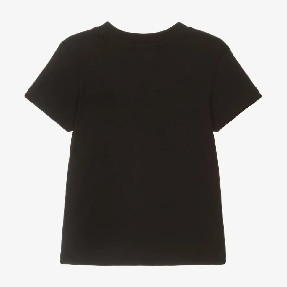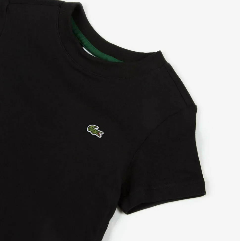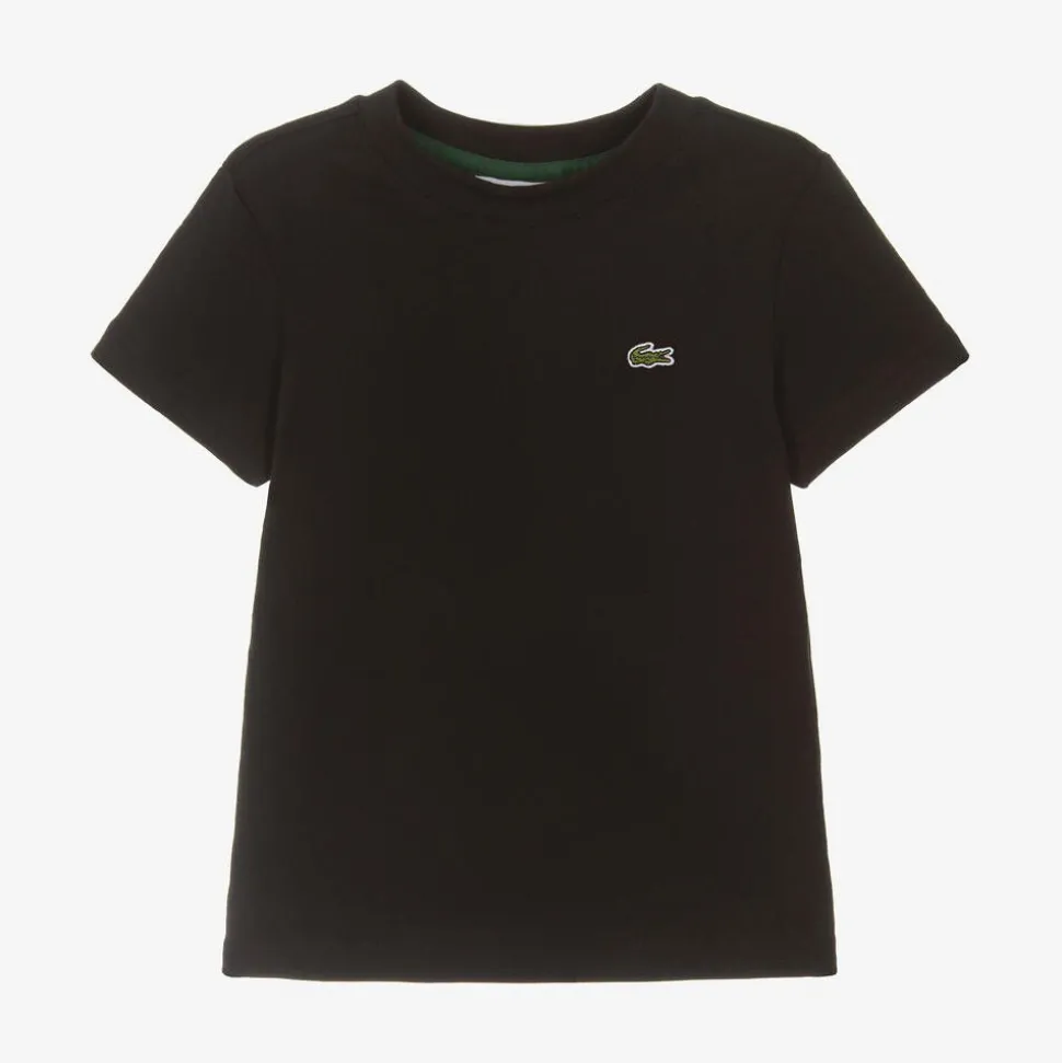 Black organic cotton T-shirt for boys and girls by Lacoste, with the brand's iconic crocodile logo patch on the chest. Casual and comfortable, this classic crew neck style is made in soft jersey.