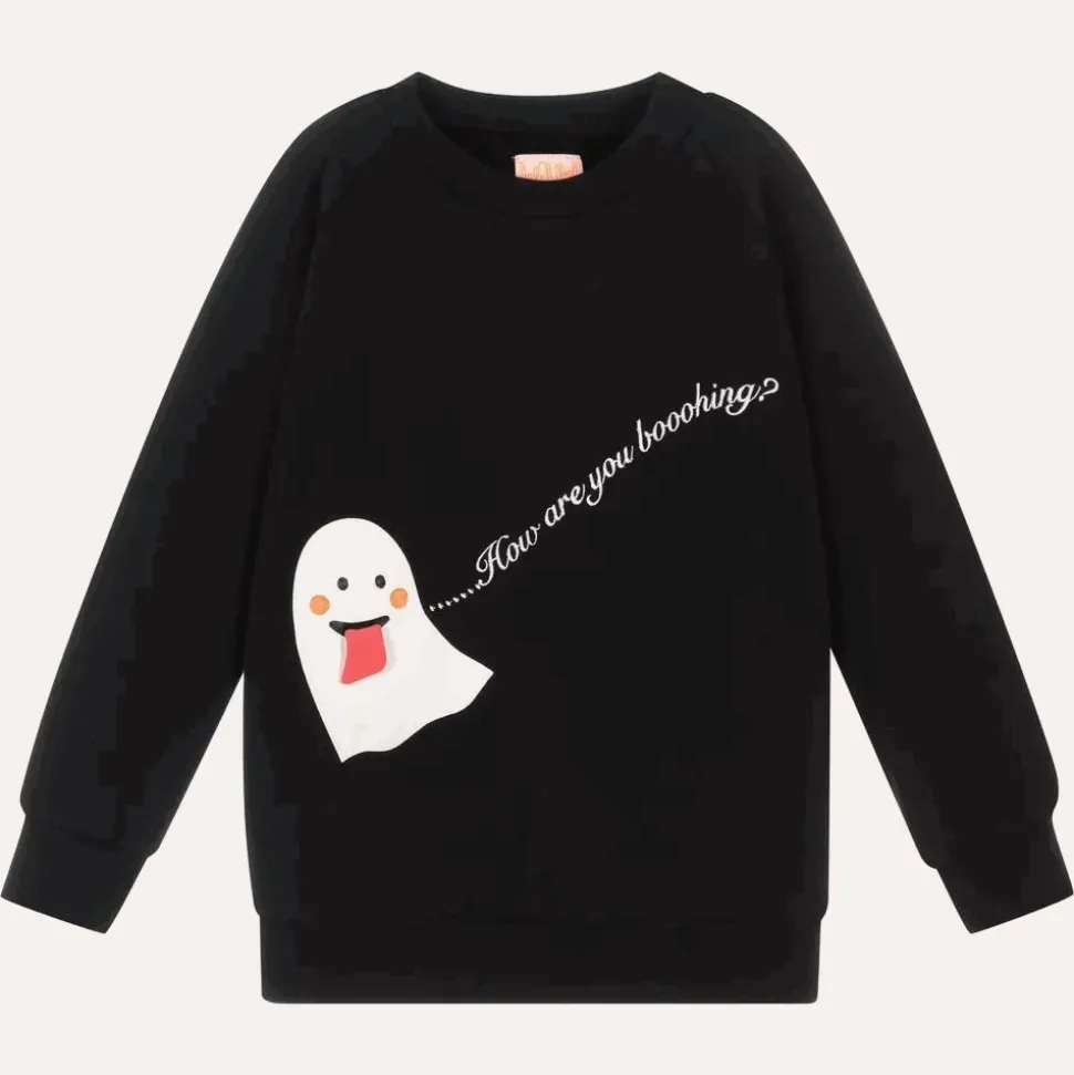A fun black sweatshirt for boys and girls by Wauw Capow, made in soft organic cotton jersey with a fleecy inside. Full of festive personality, this cosy layer has a cute and friendly ghost motif sewn on the front, detailed with a pink tongue appliqué. It sits alongside an embroidered 'How are you boohing?' slogan for a spooky finish.