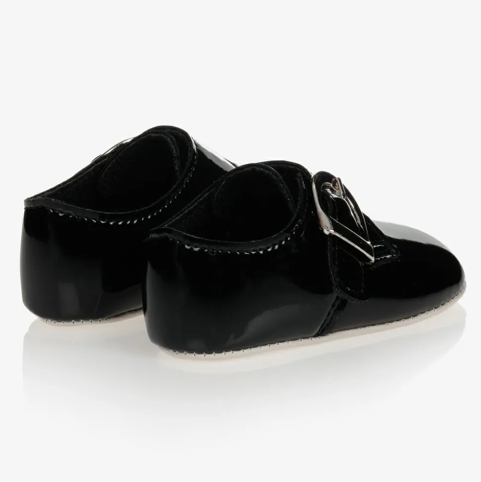 Baby boys smart, black faux patent leather pre-walker shoes by Early Days Baypods. They have a soft cushioned insole and adjustable buckle detailing.