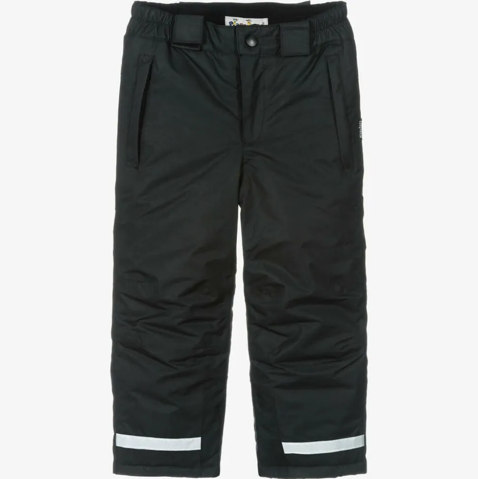 Black salopettes for boys and girls by Playshoes, with removable and adjustable black elasticated shoulder braces. Lightly padded for optimum warmth without the extra weight, they are also breathable but windproof and waterproof with the taped seams. The waistband and internal gaiters are elasticated to keep snow out and there are cuff zip and popper on the side to help when dressing. There are reflective trims for improved visibility, front zip and popper fastening and two zipped pockets.