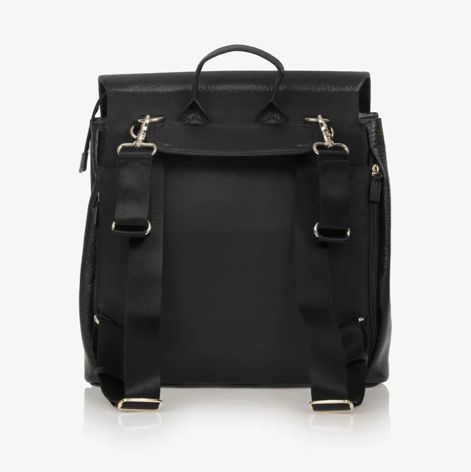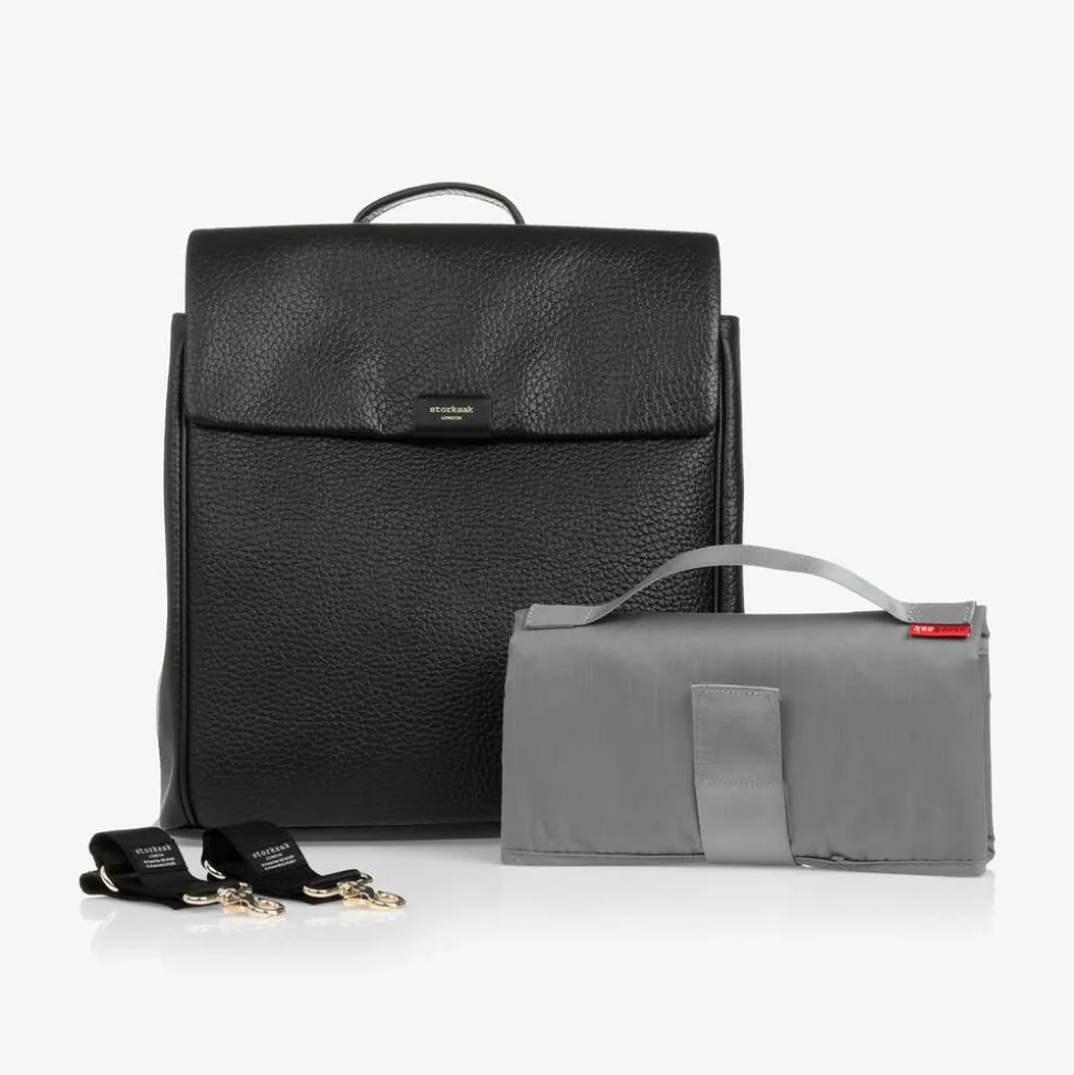 Black grained leather changing bag by Storksak, with stylish gold accents. The spacious main compartment fastens with a smooth zip, and contains elasticated and zip pouches for extra organisation. It comes with an easy-to-clean changing mat to help with changing baby on-the-go. Included are a pair of clip-on stroller straps to attach to your buggy or pram for versatile wear. The adjustable shoulder are adjustable for a great fit. There are discreet zip fastening pockets on the sides for small essentials. A gold embossed logo can be seen on the front, completing this practical baby bag with a stylish, branded touch.