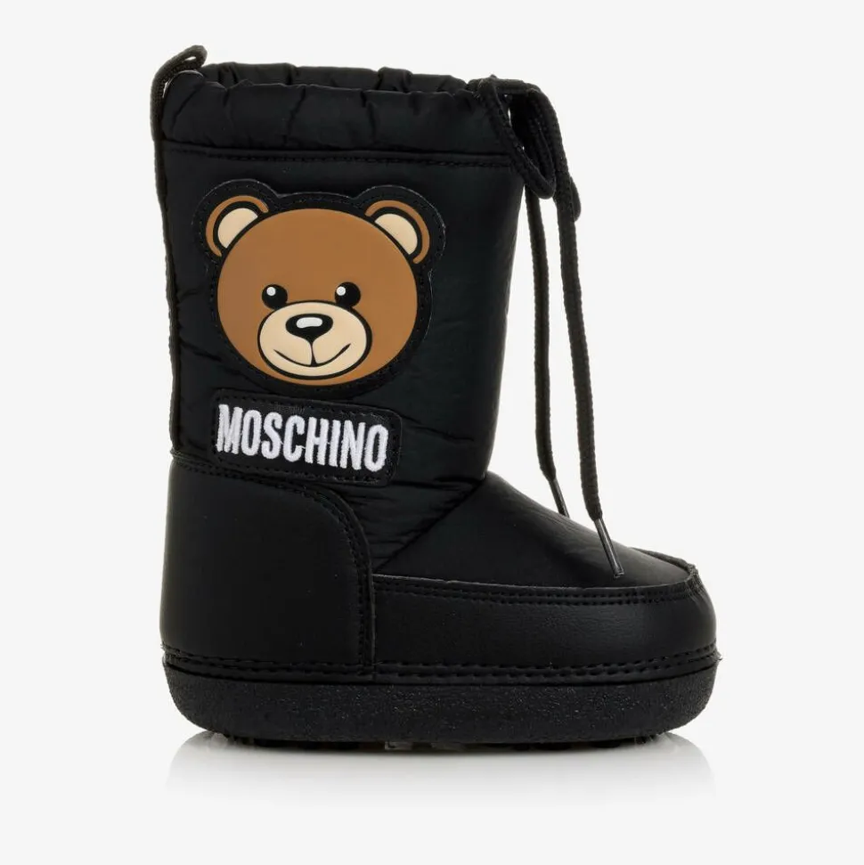 Black pull-on snow boots for boys and girls by Moschino Kid-Teen. The Moschino Teddy Bear rubberised patch can be found on the side with logo patch embroidery beneath. The calf-length textile shaft can be fastened with the drawstring to keep feet dry, warm and cosy. They are lined with super soft and snuggly fleece for added warmth. The rubber soles have textured treads to improve grip on slippery and wet surfaces.