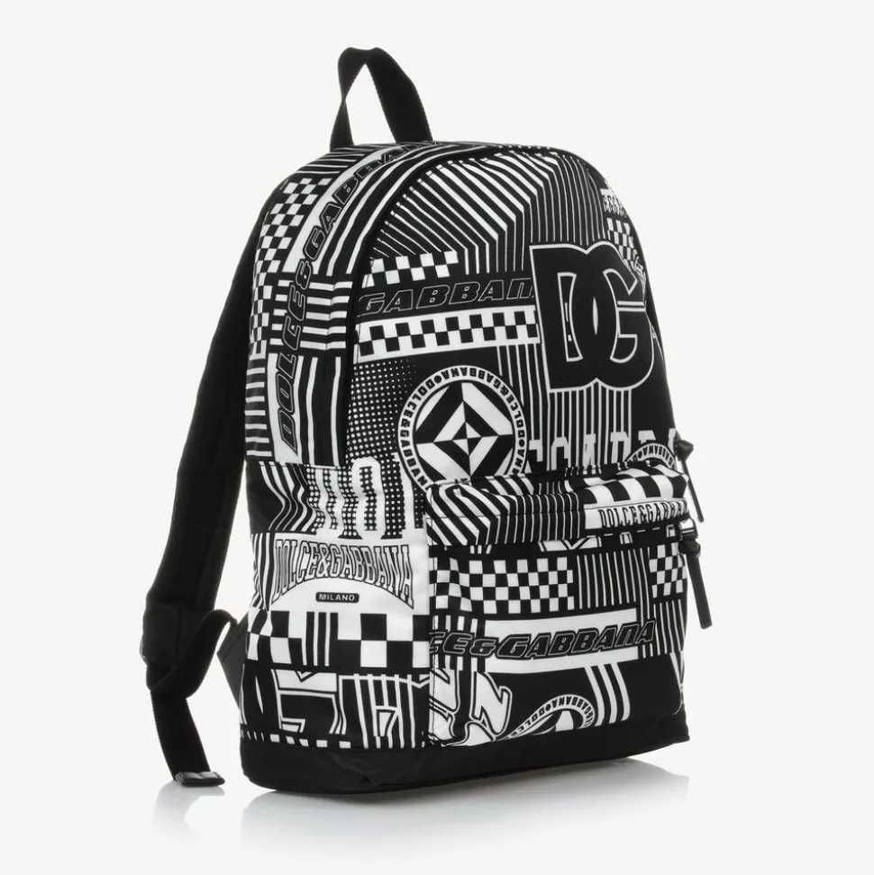 Black and white backpack for boys and girls by luxury Italian brand Dolce & Gabbana. Made in silky canvas, with a cool racing theme, it is patterned all over with the designer's DG Race prints. The spacious main compartment fastens with a zip and there is a smaller zip fastening pocket on the front. The back and adjustable shoulder straps are padded for comfort and there is a useful carry handle.