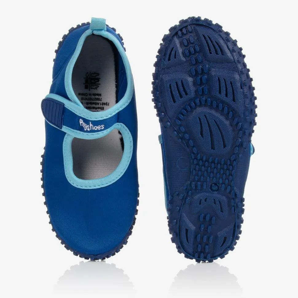 Little boys bright blue beach shoes by Playshoes, made in soft, flexible fabric with a wetsuit feel. With a slip-resistant rubber sole and a velcro strap fastening, these aqua shoes are comfortable for wearing on the beach or in and around the swimming pool.