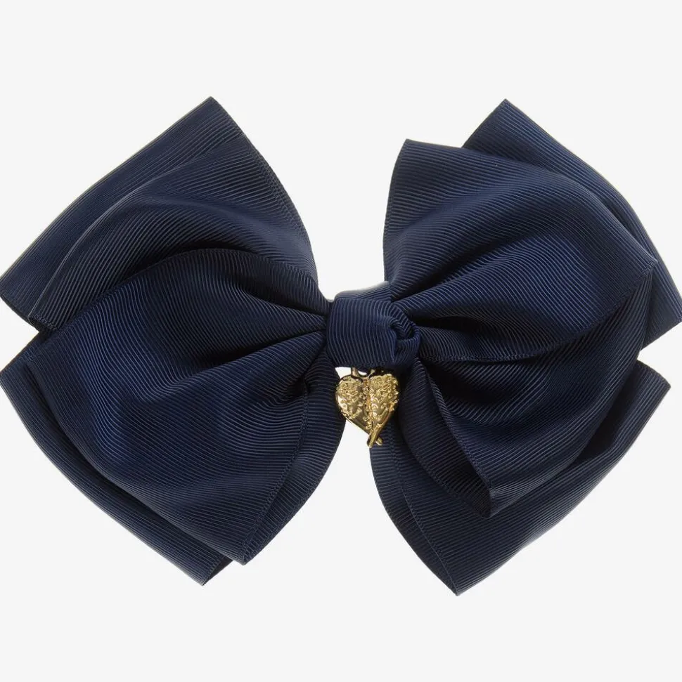 Large navy blue grosgrain bow by Angel's Face, enhanced with a golden angel wing heart charm. It has a sturdy metal clip for easy fastening.