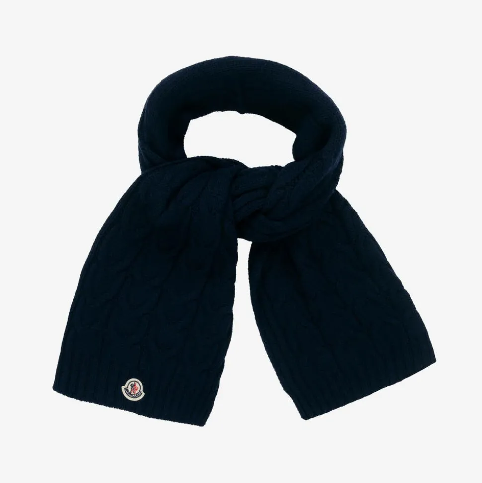 Warm and cosy navy blue scarf for boys and girls by Moncler Enfant, with the luxury brand's iconic logo on one end. In a timeless cable knit pattern, it is knitted from soft virgin wool with ribbed edges on both ends.