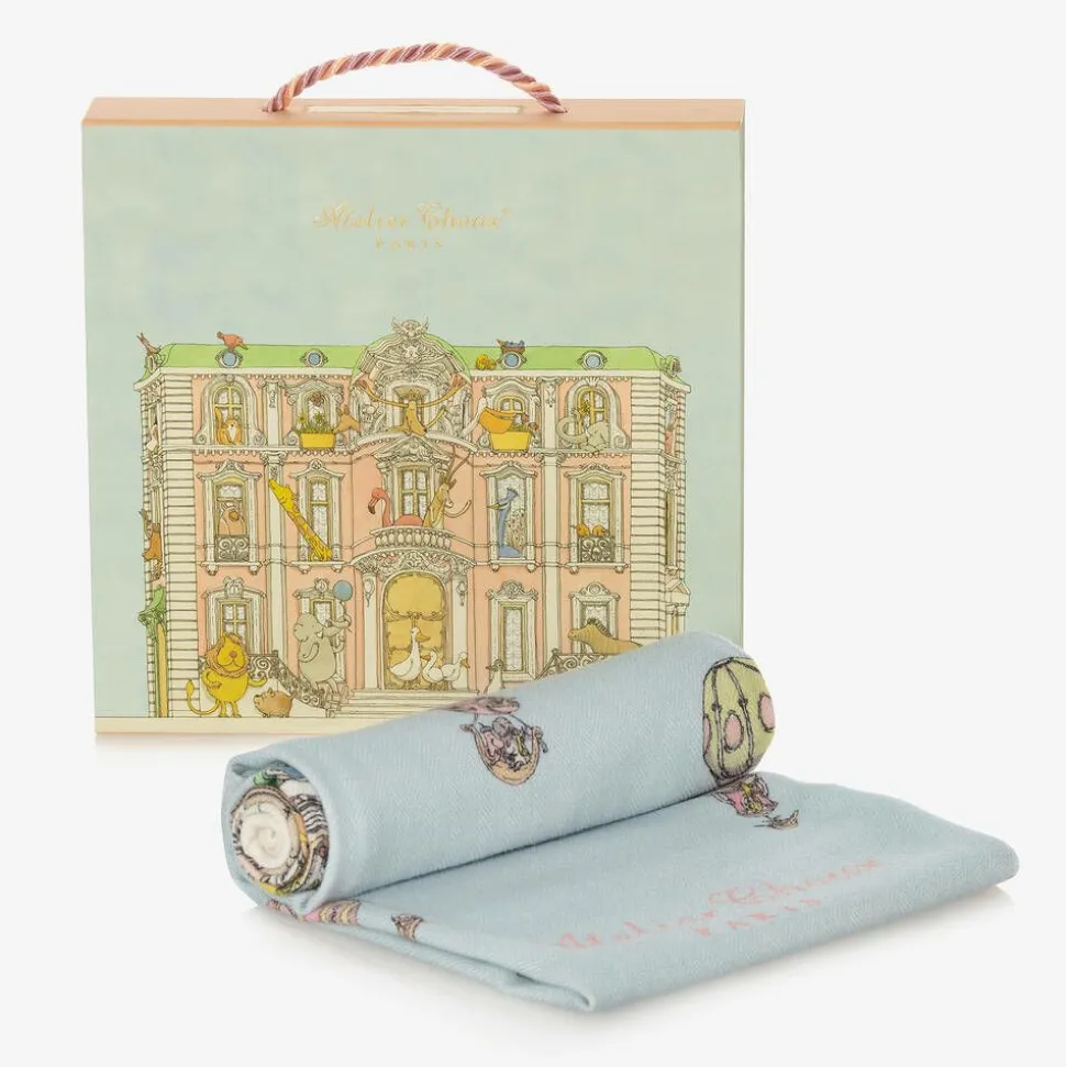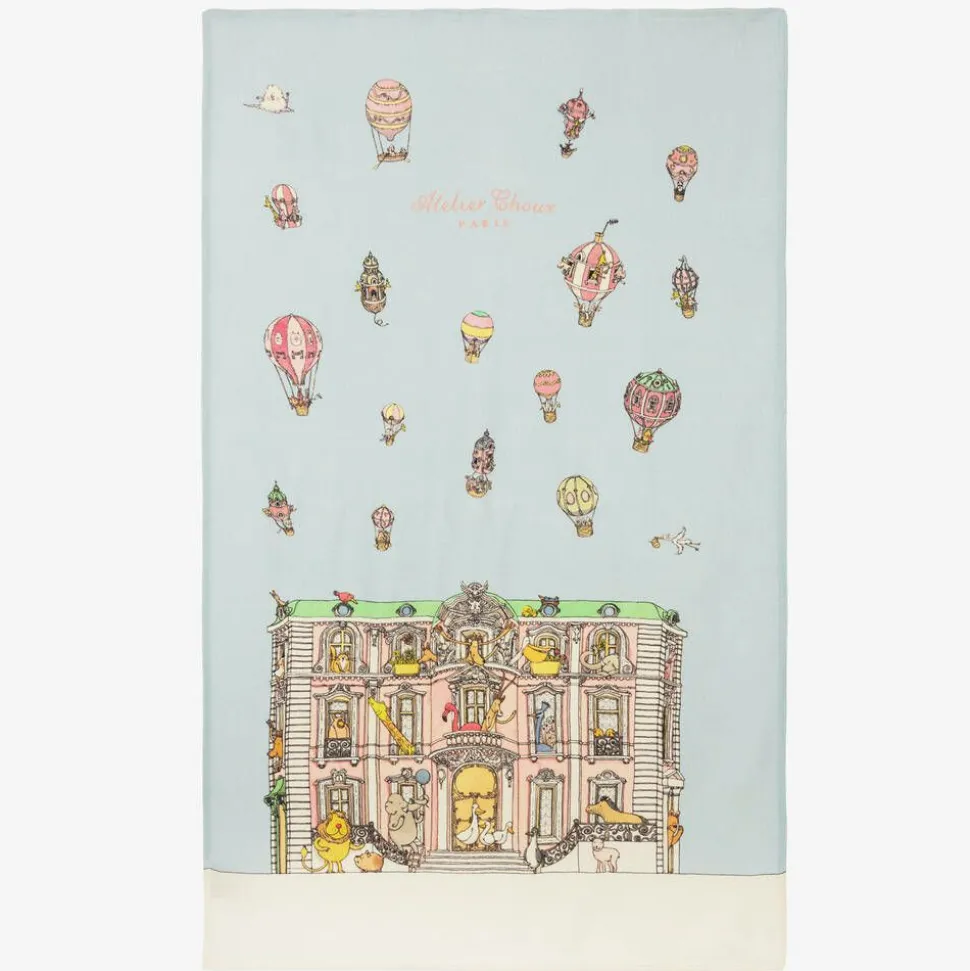 Beautiful blue blanket for baby boys and girls by Atelier Choux Paris, knitted in a luxurious cashmere and wool blend. Super soft and lightweight, it has a grand, Parisian mansion on the front with playful hot air balloons above. Gentle on the skin, this versatile nursery accessory can be used all year round as a cosy cot cover for baby, or when out and about in the stroller. It comes in a gift box that can be kept as a lovely keepsake.