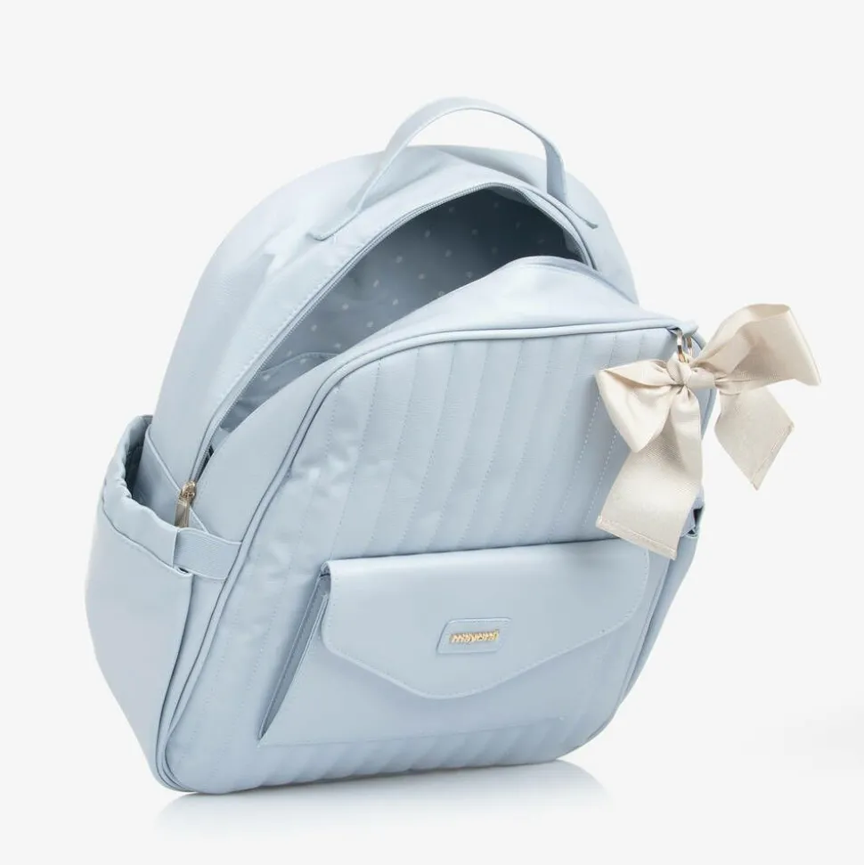 Stylish blue changing bag by Mayoral, in a practical backpack style with a decorative sparkly gold bow detail. Made in faux leather, this sturdy design has a quilted front with a gold-tone metal logo on the front flap pocket. It is fully lined and has useful internal pockets, including a thermal bottle pocket. There are elasticated pockets on the sides, one designed to hold wipes for easy access. The shoulder straps are adjustable and the bag can be stored on the stroller using the detachable velcro straps or held with the top carry handle.
