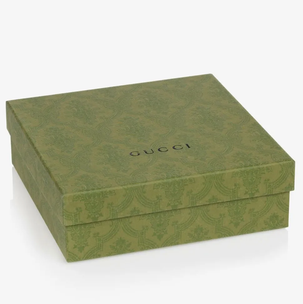 Blue three-piece babysuit set for boys and girls, by luxury Italian brand Gucci. Made from soft cotton jersey, the set is presented in a branded gift box making an ideal gift for a special little one. The shortie has the designer's vintage logo print on the chest, inspired by the adult collection. The hat and bib have instantly recognisable green and red Web logo details, with adjustable poppers on the bib for comfortable dressing.