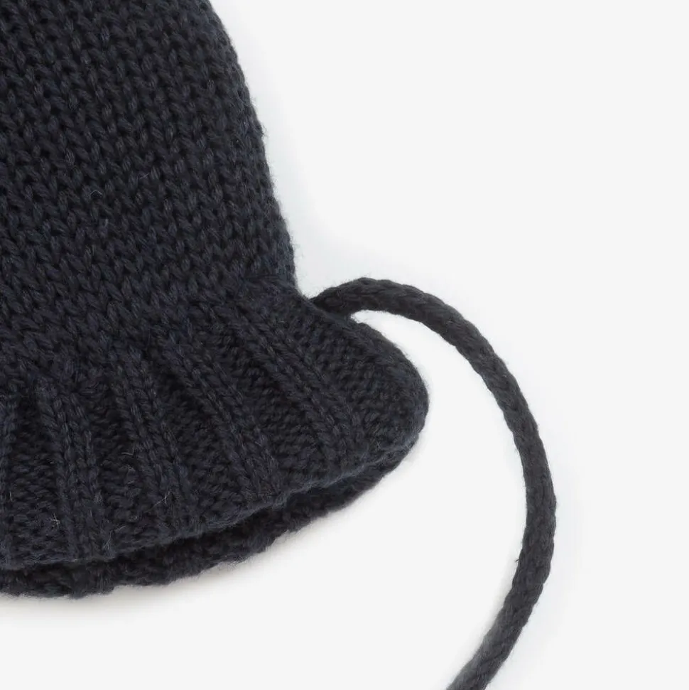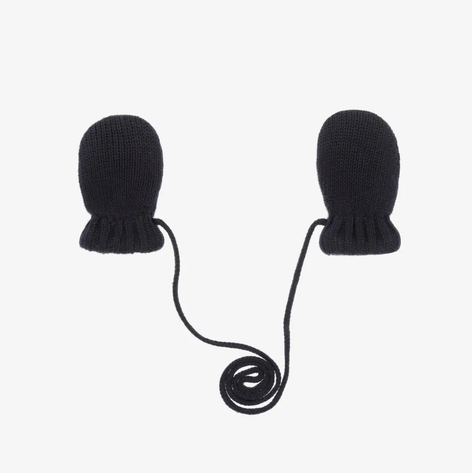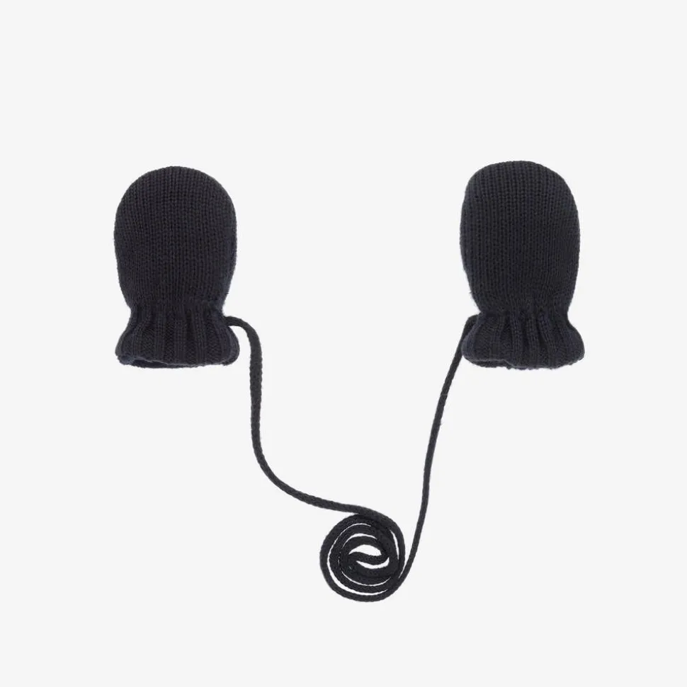 Navy blue mittens for baby boys and girls by French brand Petit Bateau. Sure to keep little hands warm, they are knitted in soft cotton and have a cosy fleece lining. Joined together with a knitted string, one mitten will not get lost without the other.