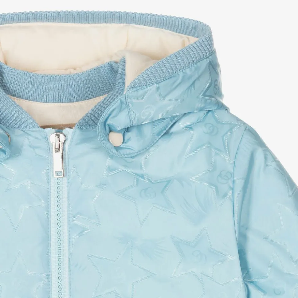 Pale blue puffer jacket for little boys and girls from luxury Italian designer Gucci, with a water-resistant coating. Made in silky jacquard with a lovely star and Double G logo pattern, it is warmly padded with soft down and has a comfortable cotton jersey lining. The removable hood and collar are trimmed with soft wool-blend rib and attach together with poppers. For added cosy wear, the cuffs and hem are gently elasticated and the jacket fastens with a branded zip.