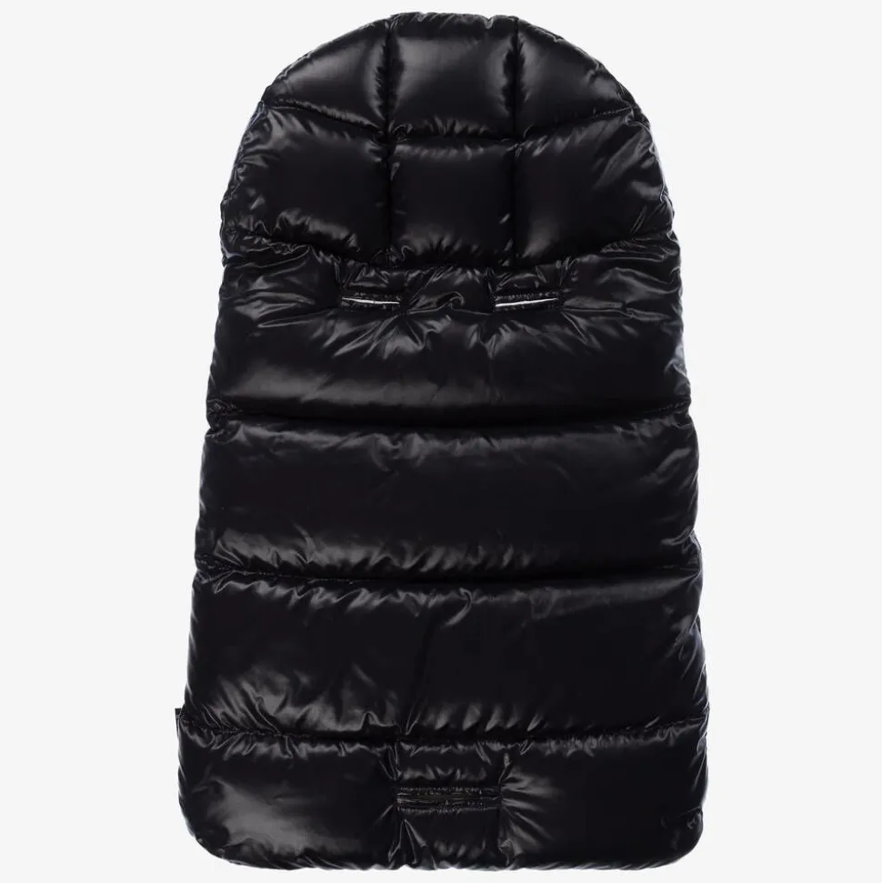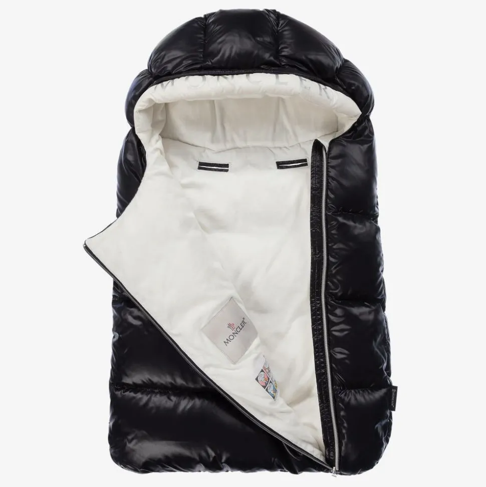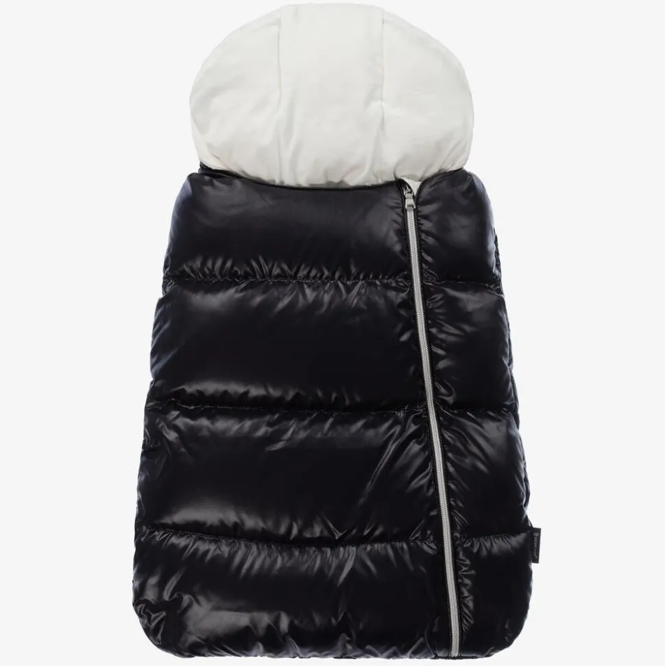 Navy blue hooded puffer nest for baby boys and girls by luxury brand Moncler Enfant. Made in smooth and shiny fabric, it is lined in soft ivory cotton jersey for comfort and has a soft down padding, helping to keep baby beautifully warm and cosy. The hood has an ivory trim around the front with a silver logo print and it fastens with an easy-to-use zip. There are openings on the back, allowing the nest to be used in a pram.