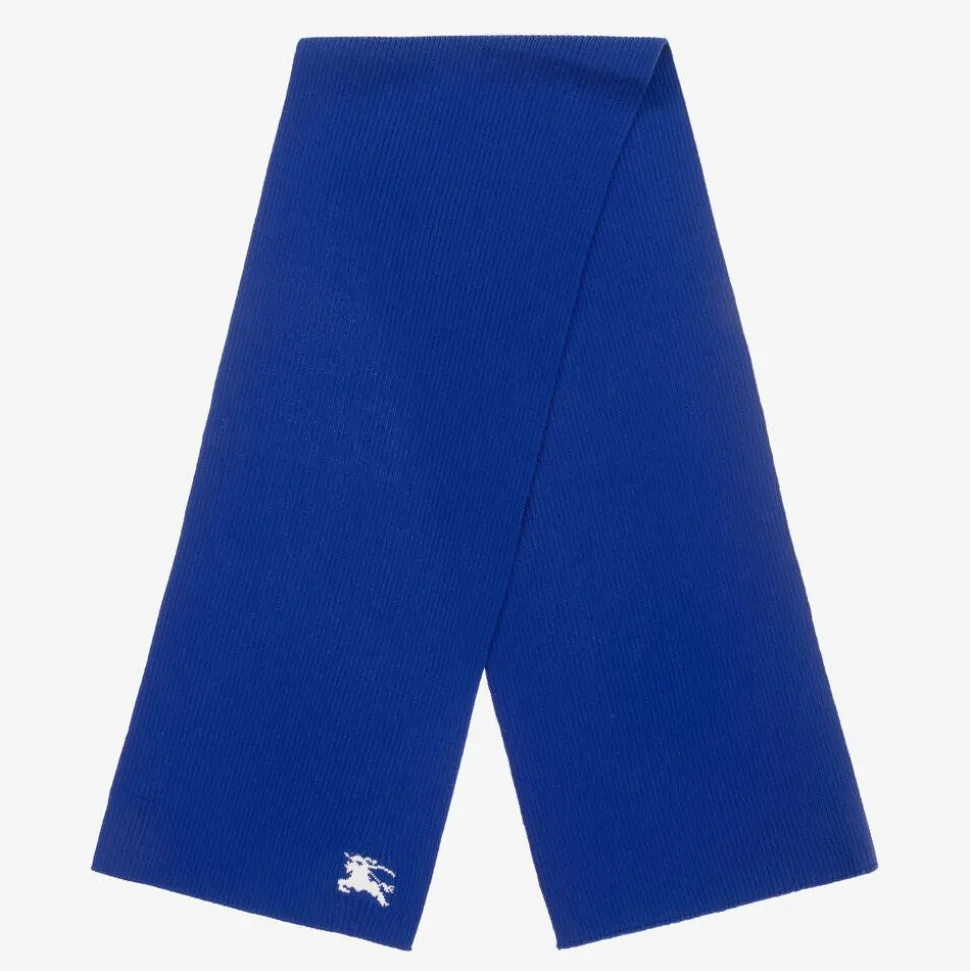A wool scarf for boys and girls from Burberry, designed in their signature Knight blue shade. Soft and stretchy, this cold-weather accessory has a ribbed texture for a gentle feel on the neck. A white Equestrian Knight Design on one end instantly signifies the luxury British brand.