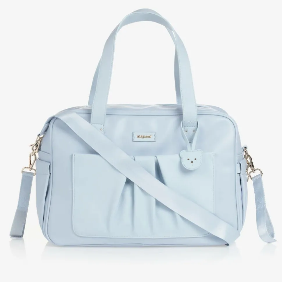 Pale blue faux leather changing bag by Mayoral, with golden metal hardware and a cute teddy bear charm. Soft yet sturdy, it has a ruched popper-closing outer pocket and logo patch above, both made in soft canvas-effect fabric for an interesting multi-textural finish. This versatile bag can be carried with the detachable shoulder strap, stored on the stroller using the buggy straps, or held with the carry handles. Lined with soft twill, there are handy interior and exterior pockets for storing baby essentials.