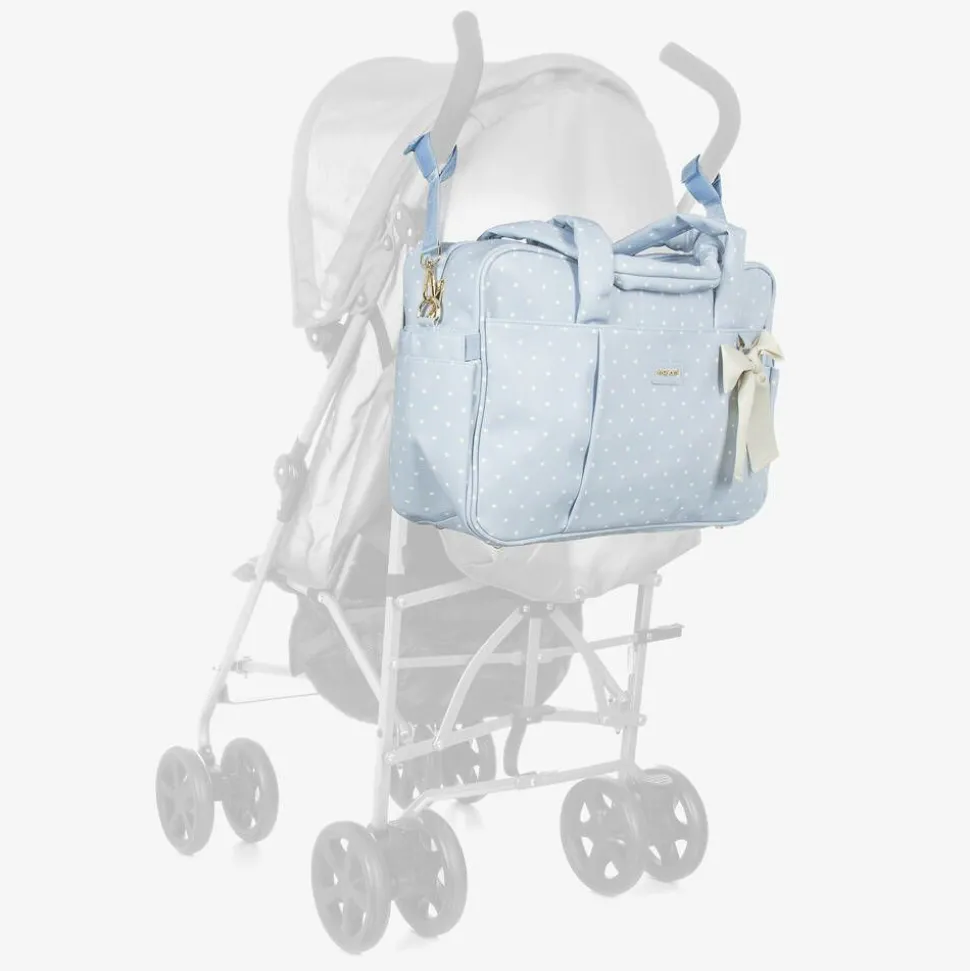 Pretty pale blue changing bag by Mayoral, made in soft faux leather. It has a sweet ivory polka dot print, with a gold metal logo and glittery ivory bow on the front. The spacious main compartment has internal pouch pockets for organising belongings, and fastens with a secure zip. It has fixed, ruched carry handles, a shoulder strap and detachable stroller straps for versatile wear. There are pouch pockets on the sides, ideal for storing bottles and a further external pocket on the front.