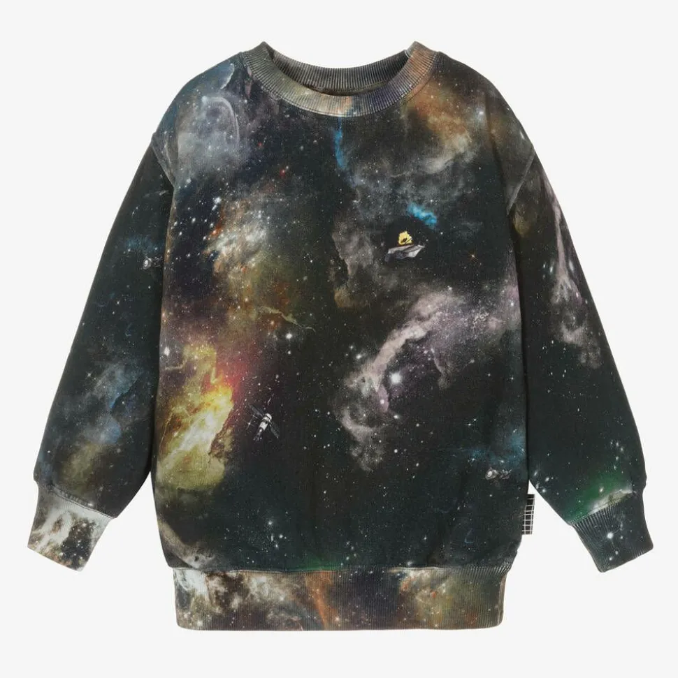 Patterned in a cool navy blue galaxy print, this casual sweatshirt for boys and girls is by Danish brand Molo. It is made in soft organic cotton jersey with a warm fleecy inside and gently ribbed trims for cosy comfort. There is a branded tab on one side for a designer finishing touch.