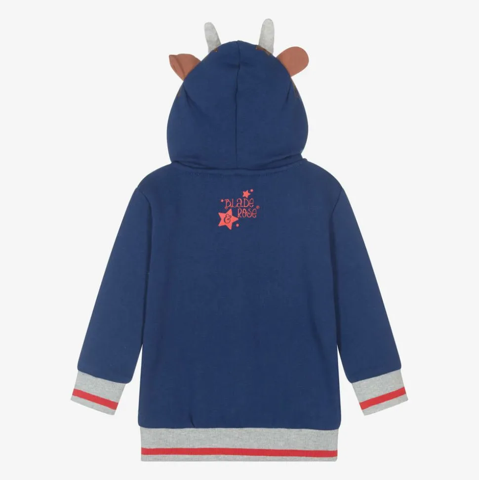 Blue cotton jersey hooded zip-up top for little boys and girls by Blade and Rose. This cosy top fastens with a zip on the front for fuss-free dressing. The complementary grey and red striped trims are ribbed for added comfort and the front pouch pockets are ideal for keeping little hands warm. The hood is lined in super soft fleece and finished with an adorable Hamish Highland cow face with 3D horns and ears.