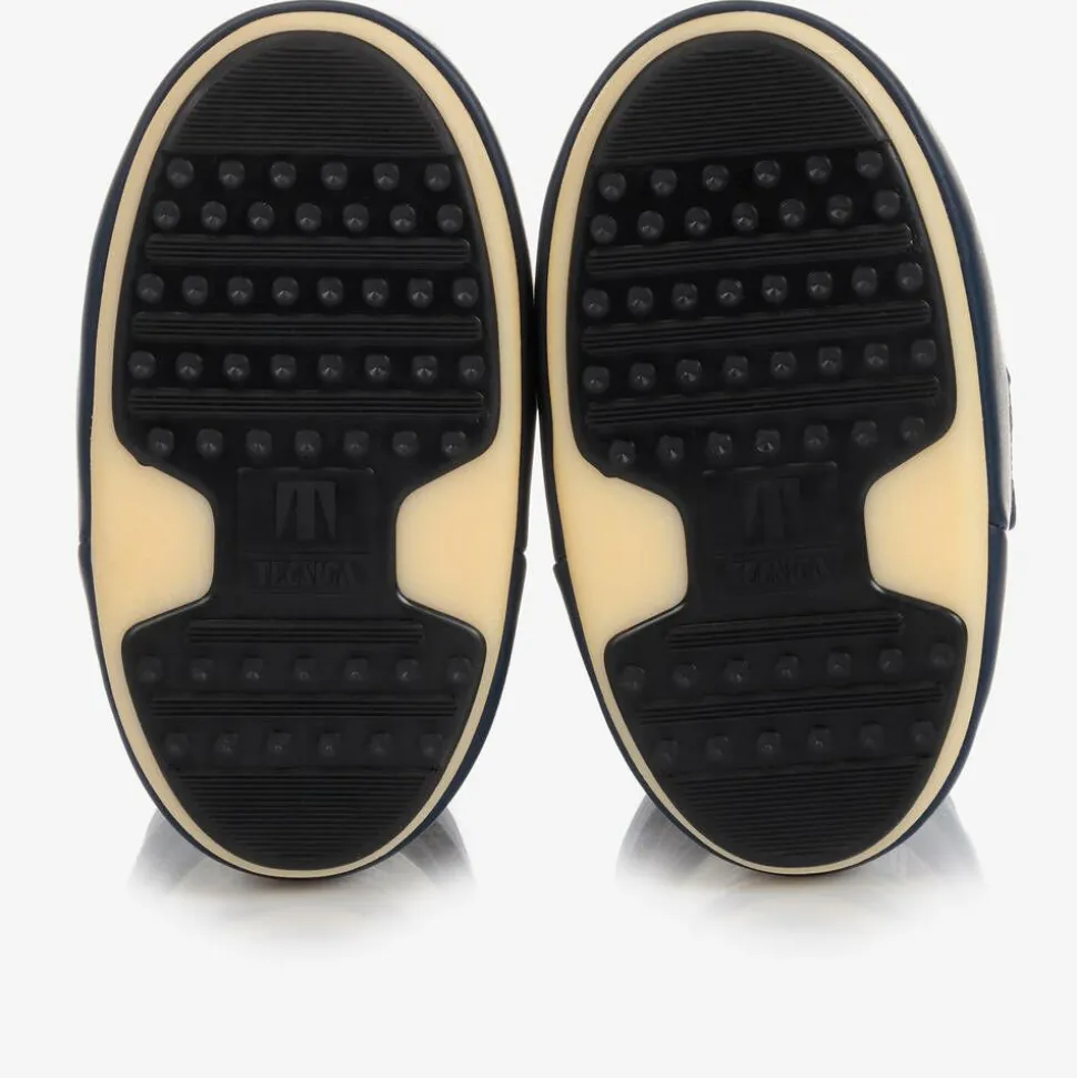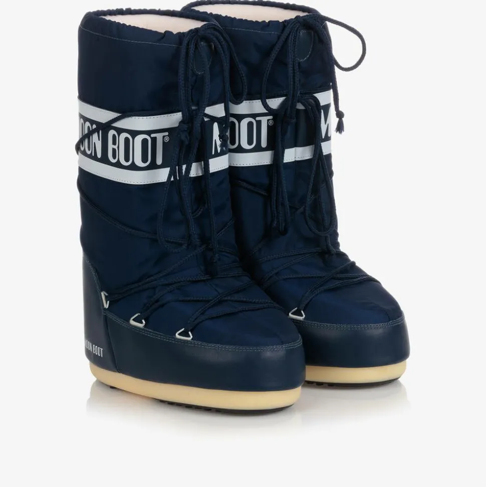 Navy blue snow boots for boys and girls by Moon Boot, with a white logo print panel for a bold, branded look. Heavily padded and ultra resistant in the original style, they feature a two-tone thermoplastic sole with little suction pads at the bottom for improved grip. They have faux leather trims, a stylish lace-up look and a drawstring ties on the ankles to lock in warmth. The technological foam lining will feel snug at first but will mould to the size and shape of the foot after a few hours of wear.