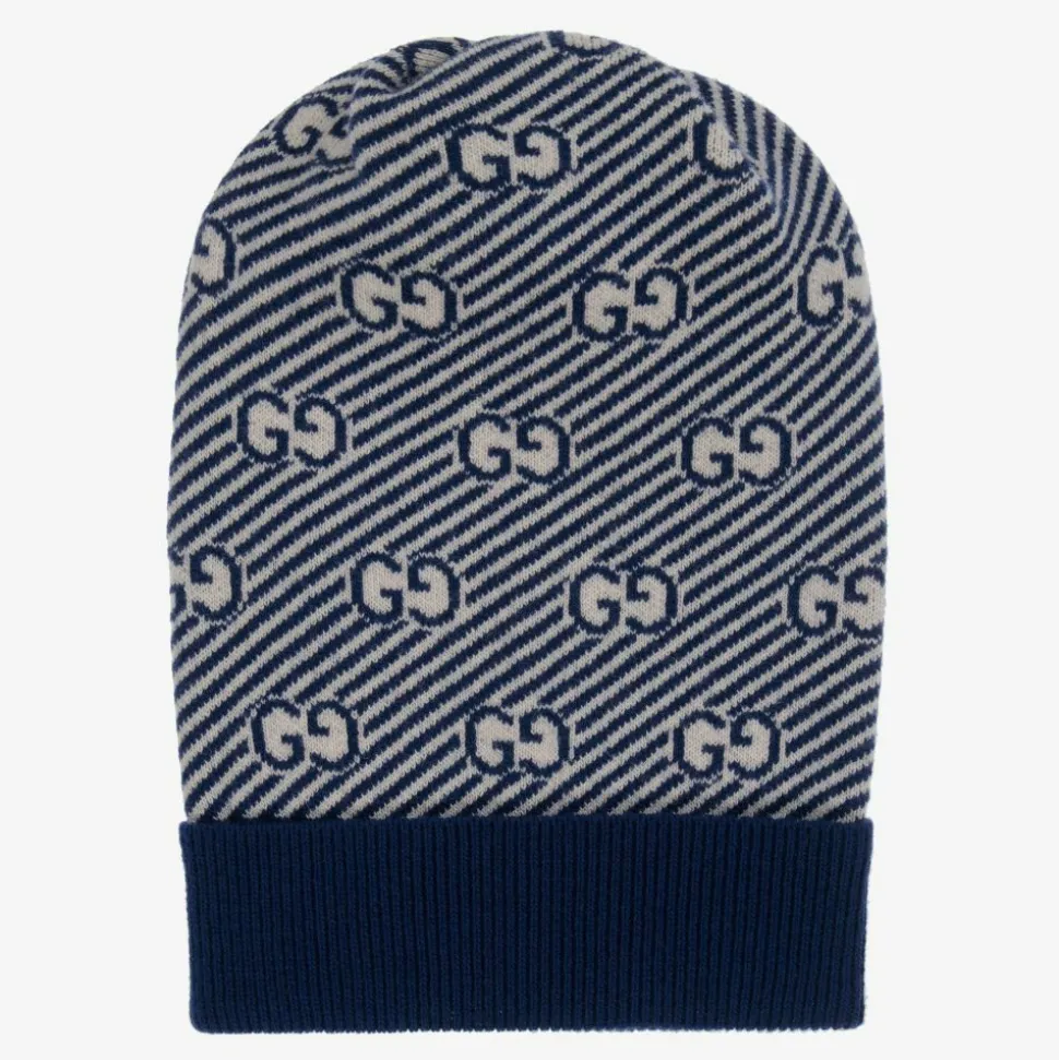 Mini-me navy blue and ivory striped slouch hat for boys and girls by luxury Italian brand Gucci, made in a soft wool knit. It has a navy blue GG logo pattern and a navy blue brim.