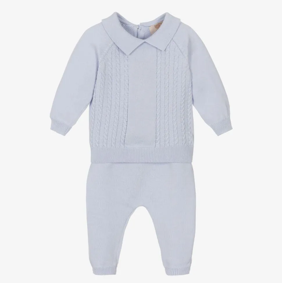 A lovely ice blue knitted sweater and trousers set for boys by Caramelo Kids. Soft and comfortable, the sweater has an attractive cable pattern with ribbed cuffs and hems. The pull-on trousers have ribbed cuffs and waist and pockets on the front.