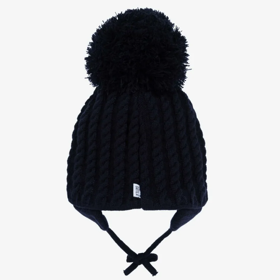 A navy blue beanie for little boys and girls by Sätila of Sweden, in a lovely cable knit design. It has a giant pom-pom decoration and ear flaps with ties that secure under the chin to keep them super cosy. For extra comfort and warmth, the hat is lined in soft cotton jersey.