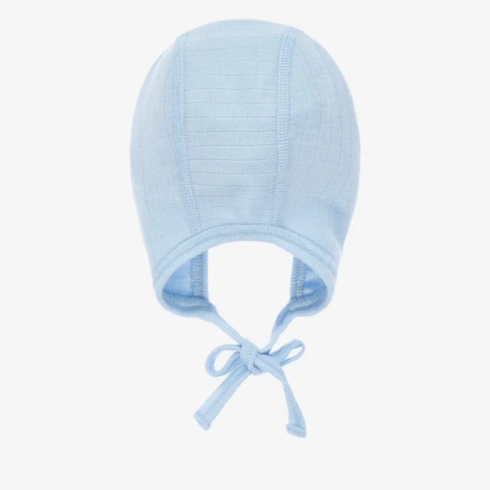 Soft blue Merino wool jersey bonnet for baby boys and girls by Joha. It fastens easily with ties under the chin and has a multi-colour striped logo tab on the side seam, for a subtle splash of colour.