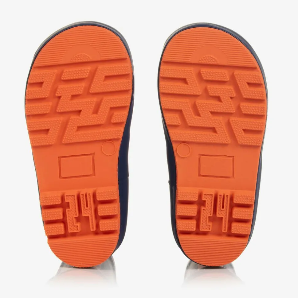 Blue and orange rain boots for boys and girls by Chipmunks, made in super smooth, flexible rubber. With a cosy textile lining to keep little feet warm, these waterproof boots have a cool monster pattern with fun, glow-in-the-dark details. There are useful handles on smaller sizes to help pull them on easily.