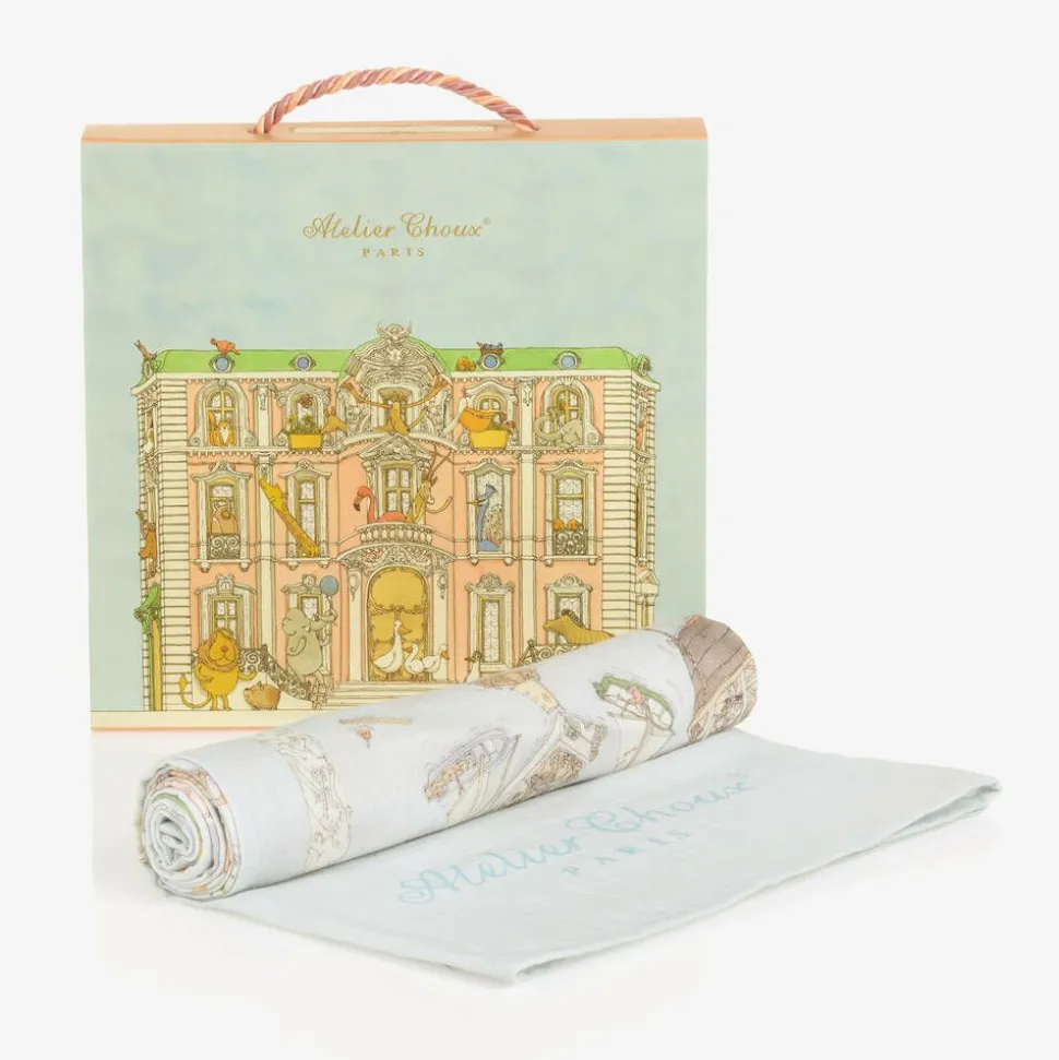 Beautiful pale blue swaddle for baby boys and girls by French brand, Atelier Choux Paris. It is made in ultra-soft organic cotton muslin with a charming boating-themed print. Lightweight, breathable and absorbent, this luxurious carré can be used for privacy while breastfeeding, for swaddling or as a tummy time blanket. It comes with a lovely gift box.