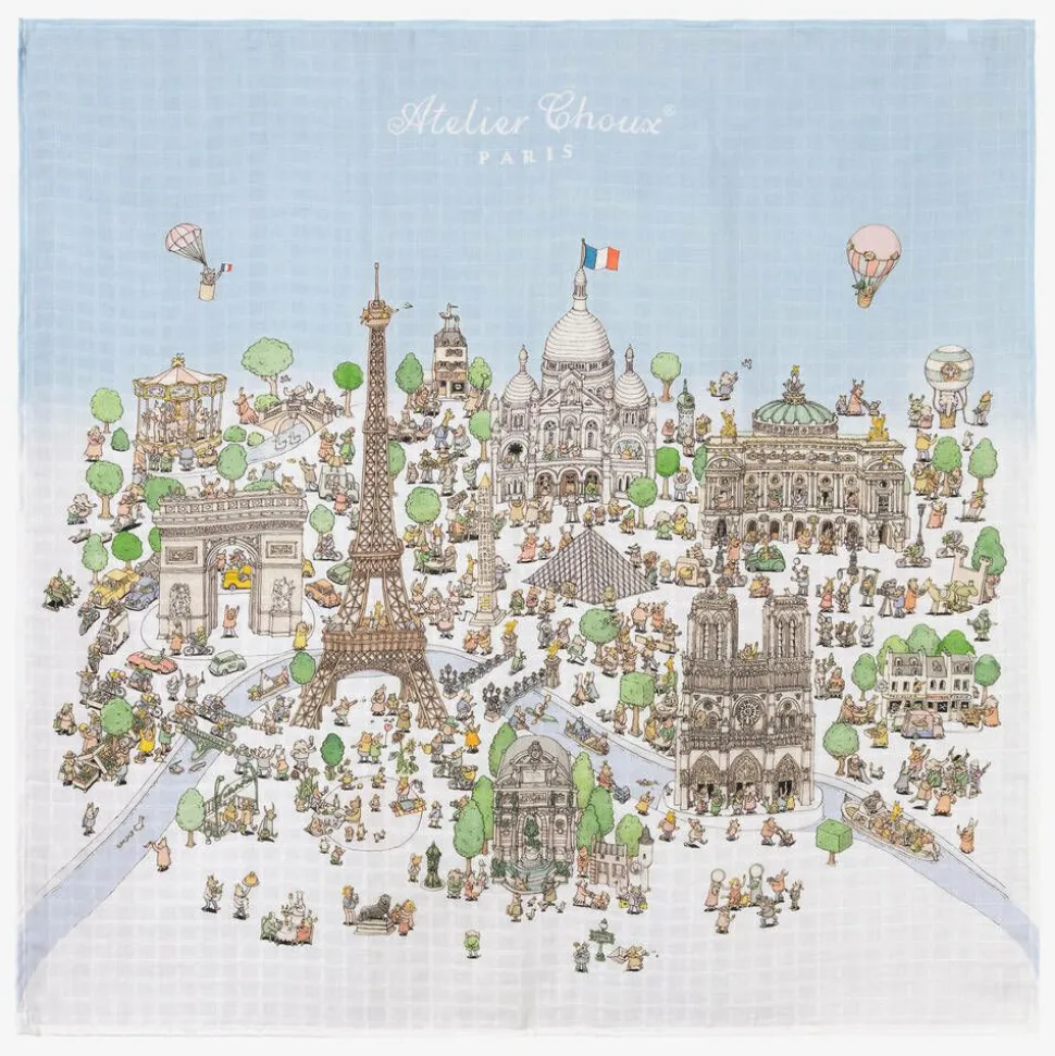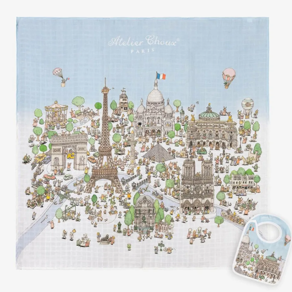 A charming, light blue swaddle and bib set for baby boys and girls by luxury French brand Atelier Choux, made in soft organic cotton. Lightweight and functional as well as beautiful, it can be used as a tummy time blanket, for baby changing, or as a decorative nursery item. The matching, double-sided bib has easy-to-use, adjustable popper fastenings for a great fit. Both pieces are beautifully illustrated with a fun, Paris-themed print and come in a complementary gift box.
