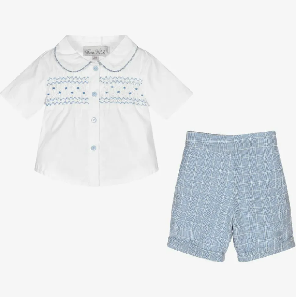 Baby boys smart white and blue three-piece cotton shorts set from Beau KiD. The white poplin shirt has a lovely smocked panel across the chest, a rounded collar and front button fastening. The pull-on shorts are in a fine houndstooth check pattern with full lining, blue trimmed side pockets and faux back pockets. To complement the look, it comes with a flat cap in matching check.