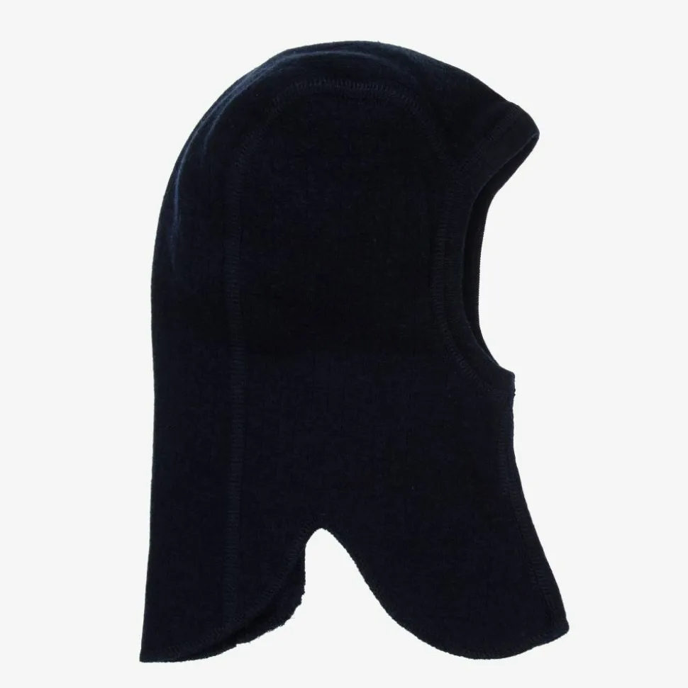 A navy blue balaclava for little girls and boys by Joha. Soft and comfortable, it is made in a thermal, pure Merino wool jersey.