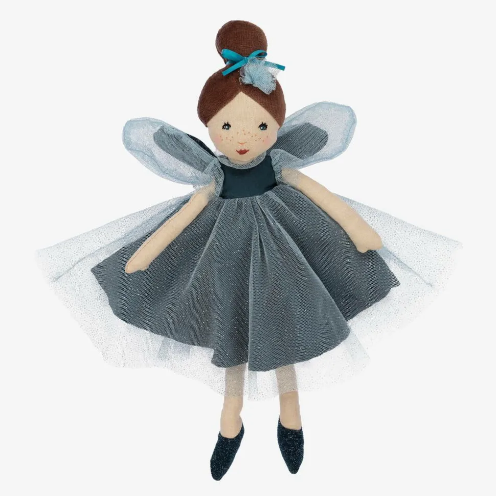 An enchanting blue fairy doll for girls by Moulin Roty, with a sweet embroidered face. Wearing a beautiful dress with a sparkly tulle overlay, she has delightful fairy wings and lovely navy blue ballet shoes. Softly padded, she has a pretty ribbon and tulle rosette in her hair. Her dress fastens with velcro on the back for easy removal.