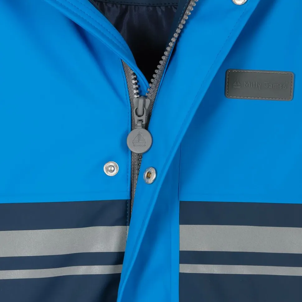 Rain wont stop play with this waterproof raincoat and salopette combination for boys and girls by Mitty James. Exclusive to Childrensalon, the set is colourblocked in shades of blue, is super soft, comfortable and easy to wear, with reflective detailing for safety. The jacket is warm and cosy, with a fleece-lined hood, stand-up collar and elasticated trims for extra cosiness. There is a flap over the front zip that fastens with branded poppers to keep the weather out and the warmth in, and a rubberised grey logo badge on the front. It has a satin lining and useful, concealed side pockets. The matching salopettes have adjustable, elasticated shoulder straps and popper fastenings on the sides for a good fit. The elasticated cuffs have detachable stirrups to keep them in place.