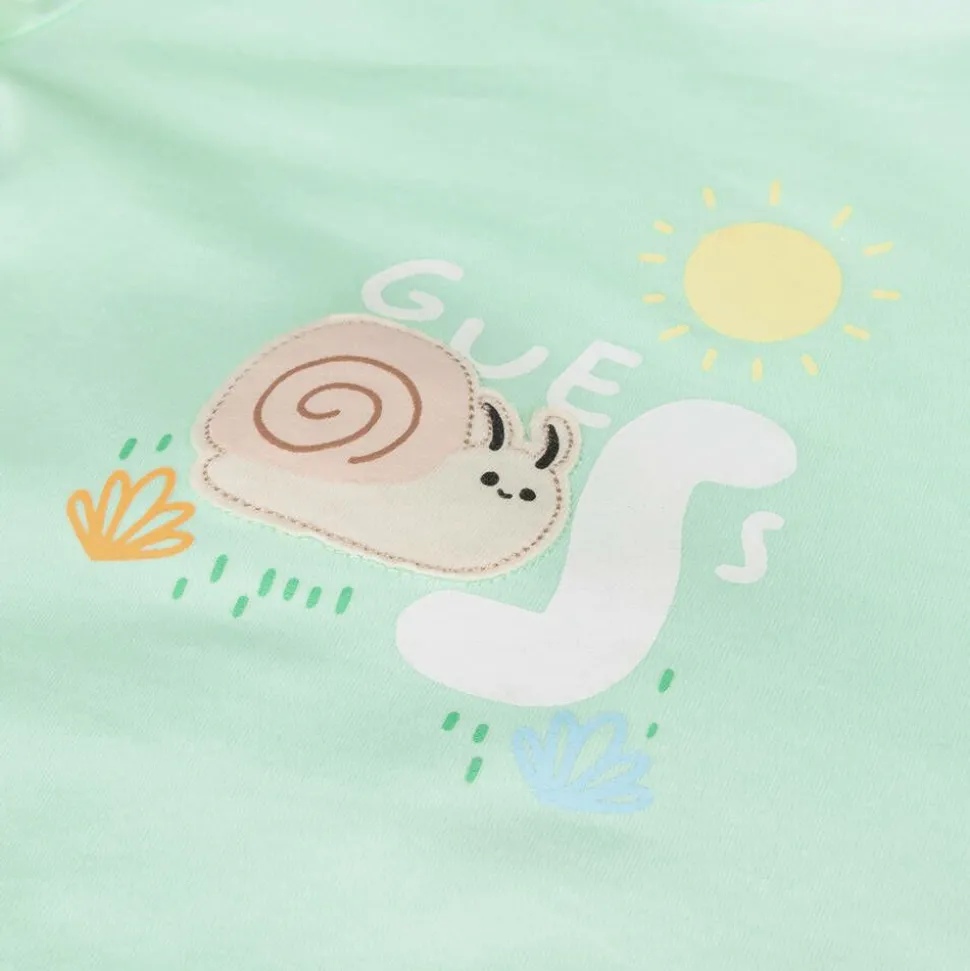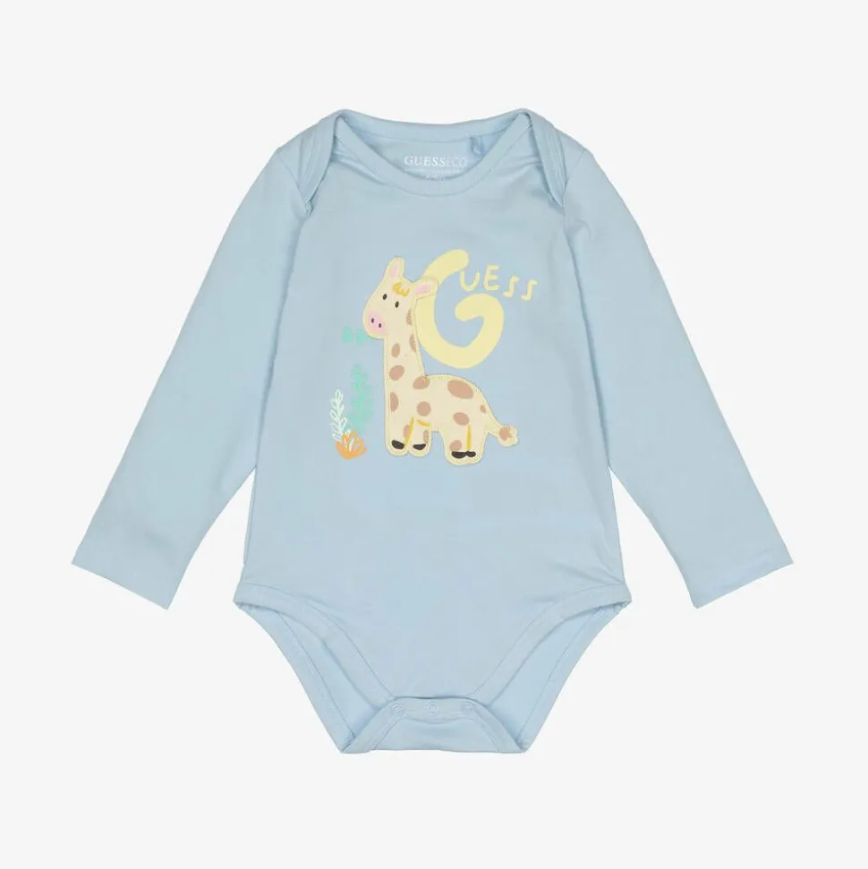 A lovely pack of five bodyvests for baby boys and girls by Guess, in shades of blue, yellow, green, beige, and white. Made from soft cotton jersey, each bodyvest has a branded design with an appliqué animal on the chest, featuring a giraffe, unicorn, elephant, snail, and stork. They have practical envelope necklines and popper fastenings between the legs to help with dressing. This pack contains organic cotton fibres.