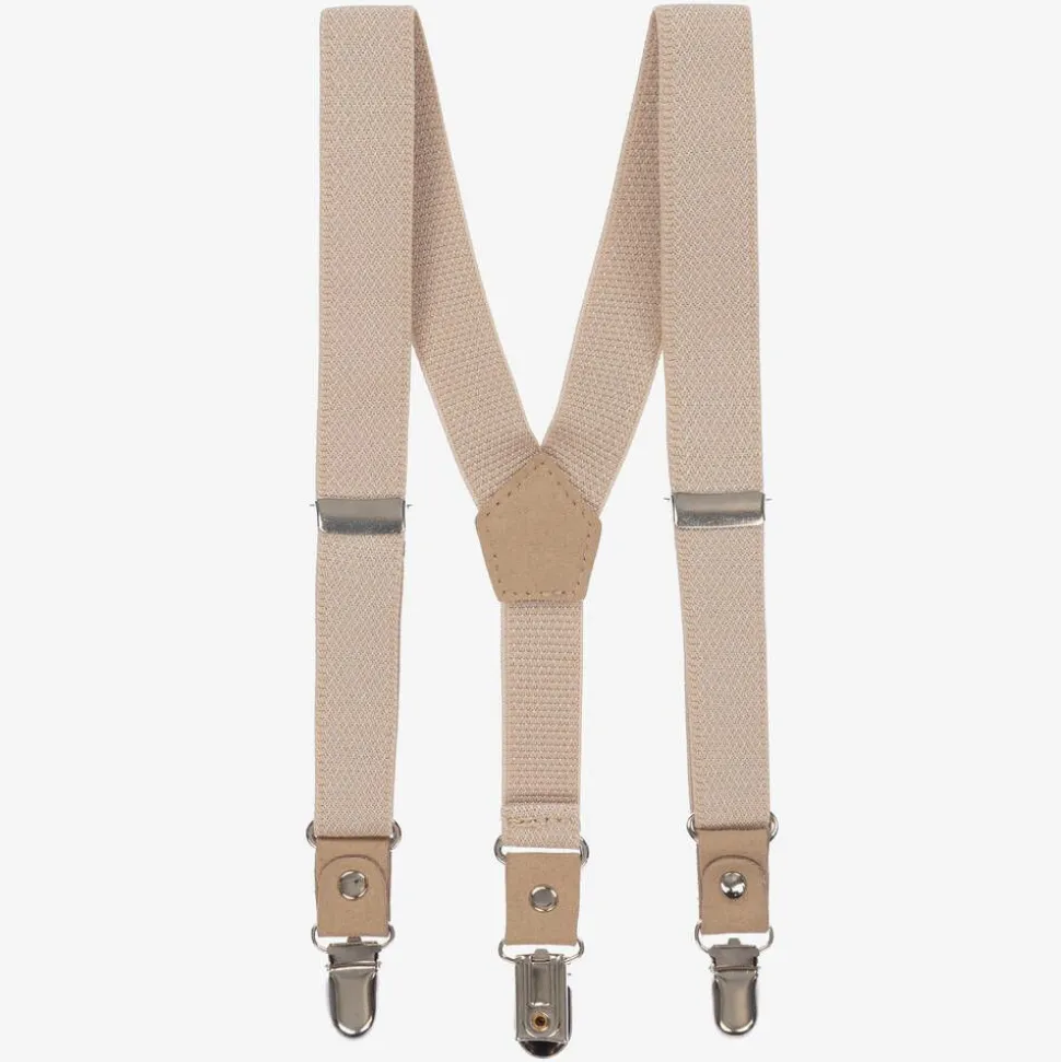 Beige clip-on braces for younger boys by Tutto Piccolo. They are elasticated and adjustable for a comfortable fit with silver clasps to attach to the waistband. Simply branded on the back, these versatile braces can be paired with trousers or shorts, adding sophistication to a smart or casual outfit.