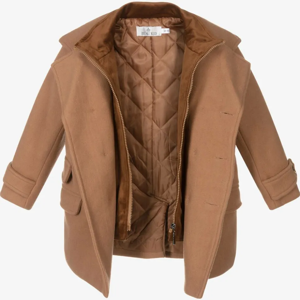 Dark beige coat and cap set for boys by Beau KiD. Super soft and comfortable to wear, it has a smart collar and double-breasted button closures on the front for a timeless silhouette. To lock in warmth, it has an interior zip fastening with super soft velour trims for extra comfort. There are useful front flap pockets and classic button detailing on the cuffs. It comes with a matching flat cap with a small stiff brim in the front to complete a traditional look.