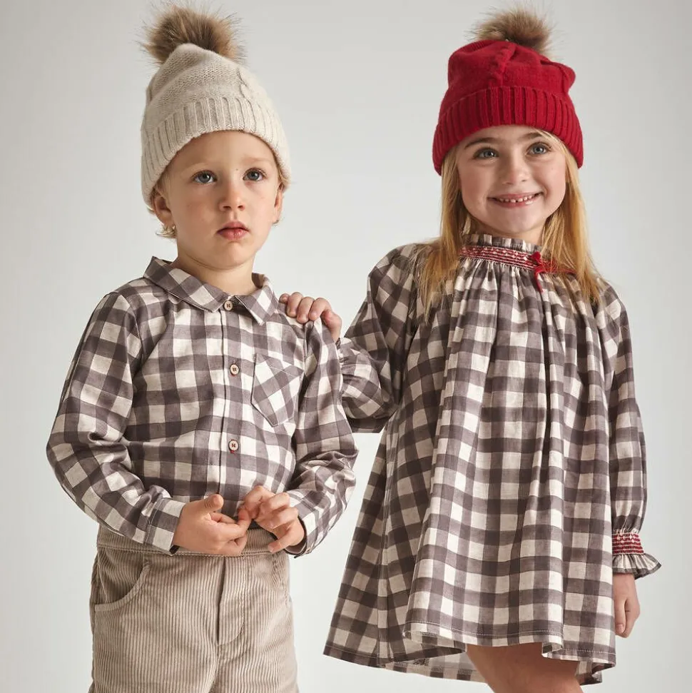 Beige trouser set for younger boys by Babidu, woven in soft cotton. The beige and grey checked shirt has red detailing on the faux wooden button fastenings. It pairs with soft corduroy trousers that have useful front pockets and a partly elasticated waist for a comfortable fit.