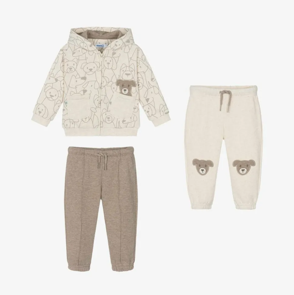 Little boys tracksuit set from Mayoral, in a co-ordinating beige and brown dog-themed design. All the pieces are made in comfortable cotton blend jersey with a fleecy underside for extra softness. The zip-up hoodie has an all-over print and patch pockets on the front, one with a cute brown dog appliqué. It can be paired with beige or brown joggers, both with cuffed ankles, extra durable knees and a drawstring on the waist for an adjustable fit.