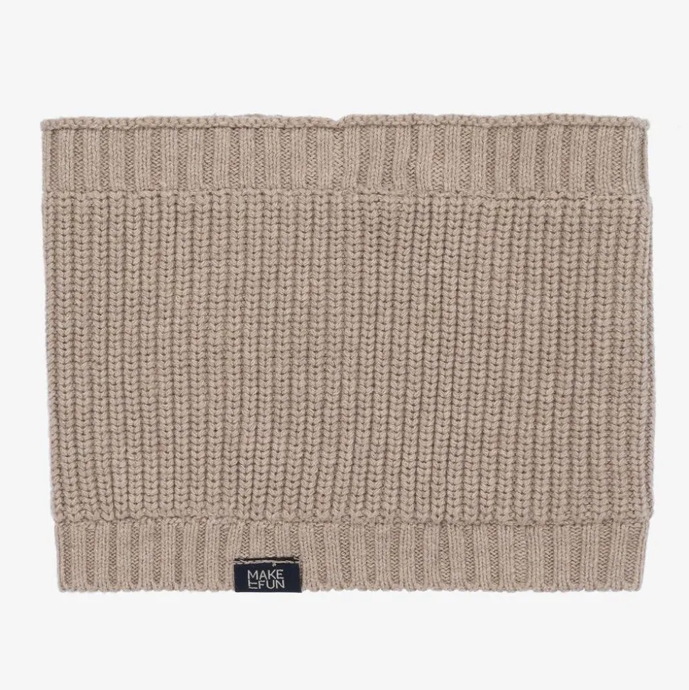 Beige snood for boys by Mayoral, knitted in soft cotton in a mid-weight ribbed design. Cosy and comfortable, it has a warm polar fleece lining, ribbed trims and a navy blue 'Make It Fun' tab on the front.