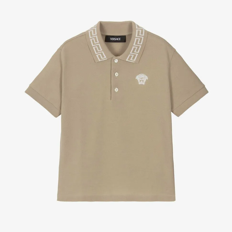 Casual beige polo shirt for boys by luxury brand Versace, made in soft cotton piqué. This short-sleeved style features the designer's iconic Medusa logo embroidered on the chest, with their signature Greca trim on the ribbed collar.