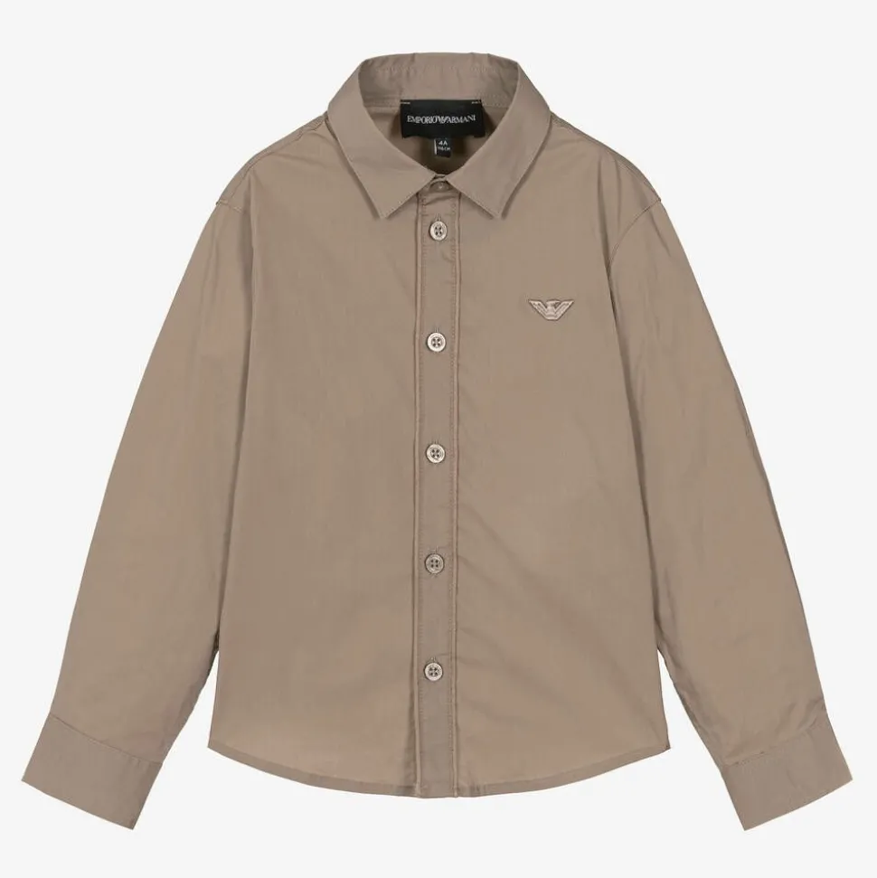 Dark beige cotton shirt for boys by Italian brand Emporio Armani, made in smooth poplin with added stretch for comfort. Suitable for smart-casual wear, it has long sleeves, a pointed collar, and branded button fastenings. A tonal embroidered Eagle logo on the collar adds a signature finish.