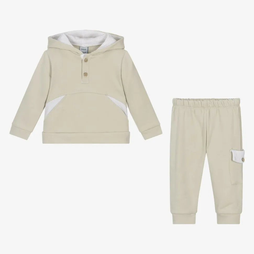 A muted beige cotton tracksuit for little boys by Babidu, comfortable in soft mid-weight jersey. The hoodie has natural button closures on the front, striped accents, and a pouch pocket. Cute and coordinated, the cuffed joggers have an elasticated waist and matching striped trims on the pocket.