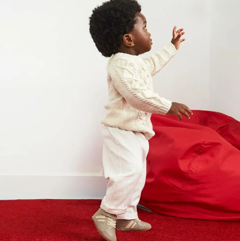 Beige leather first walker shoes for little boys by Old Soles, in a trainer style with contrast ivory trim. This cute style has elasticated laces and an easily adjustable velcro strap. Designed to promote natural movement and healthy foot growth, they are soft and supple with plenty of room for wiggly toes. They have a leather lining and a removable, cushioned insole that is breathable and antibacterial. The flexible, grippy outer sole allows for the natural development of sensation, balance and strength.
