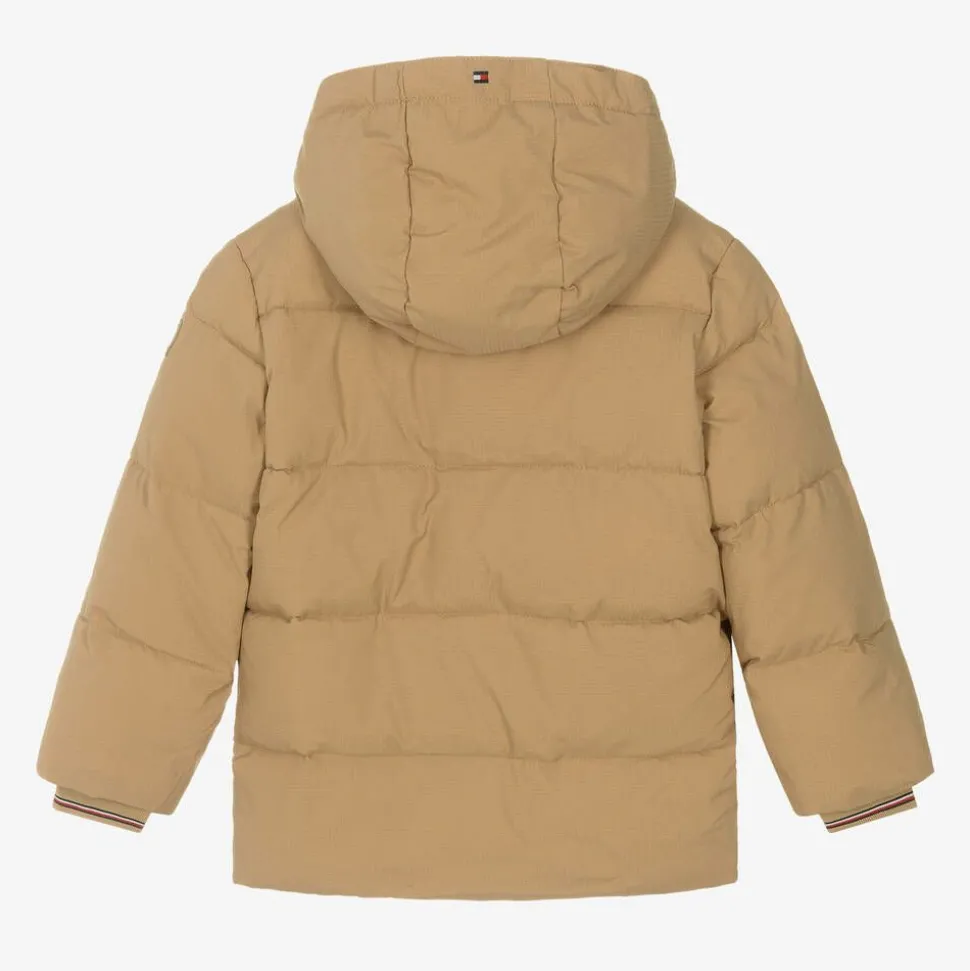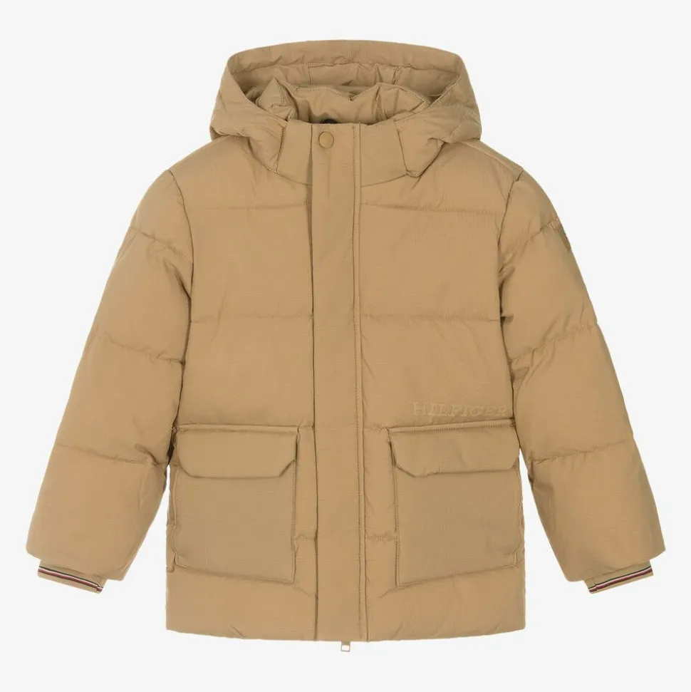 Sandy beige puffer jacket for boys by Tommy Hilfiger, made in smooth, coated ripstop fabric. Warmly padded and showerproof, this cosy jacket has a removable hood and ribbed cuffs for extra protection from the elements. There are popper fastening flap pockets on the front with additional patch pockets underneath and a tonal logo above. It fastens with a concealed zip and poppers and has subtle branded details on the sleeve, hood and cuffs for a statement finish. This product contains at least 50% recycled fibres.