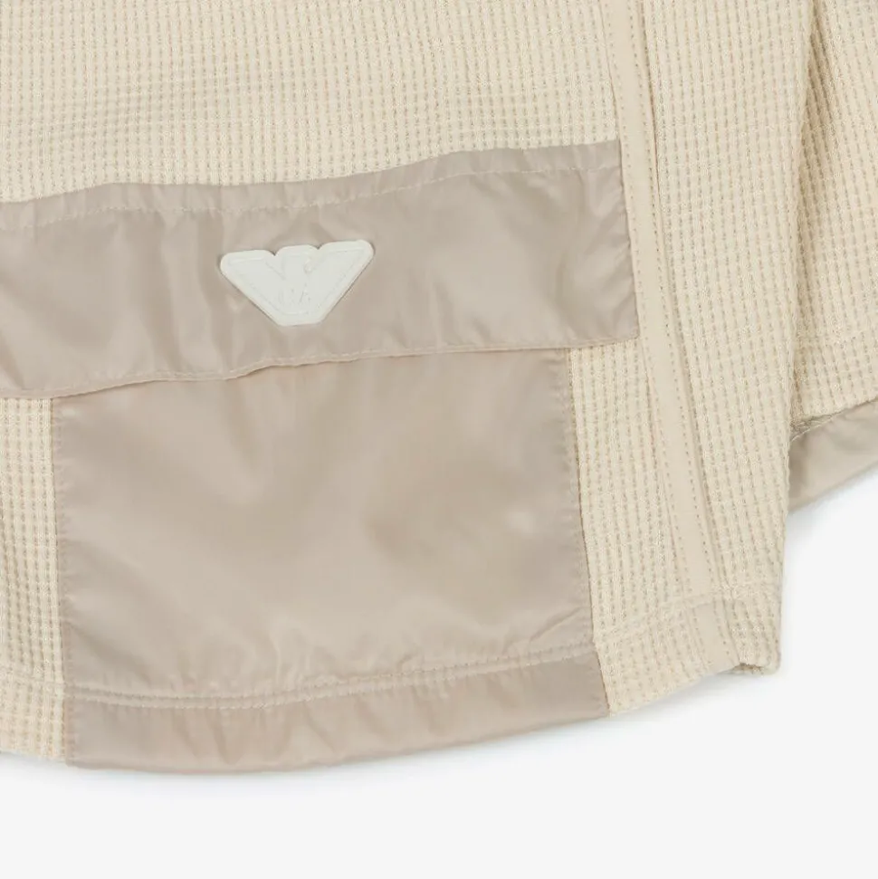 Casual beige cargo shorts for boys by Italian label, Emporio Armani. They are made in soft waffle organic cotton jersey with an elasticated waist and faux drawstring ties. Silky patch pockets on each leg add a stylish touch, with the signature Eagle logo on one side for a distinctive finish.
