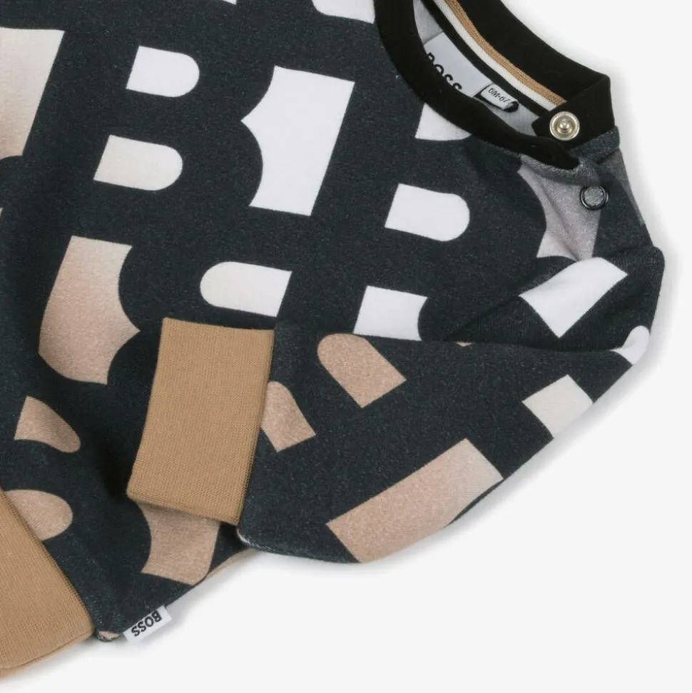 An eye-catching sweatshirt for little boys by BOSS, patterned with the distinctive Monogram logo in the signature colours of black, beige and white. Made in comfortable, mid-weight cotton jersey with a cosy fleece feel inside, it has useful popper fastenings on one shoulder. An embroidered logo tab on the side seam completes the designer look.