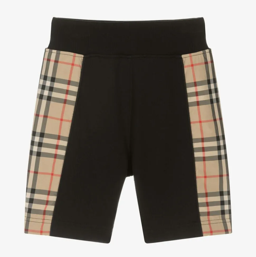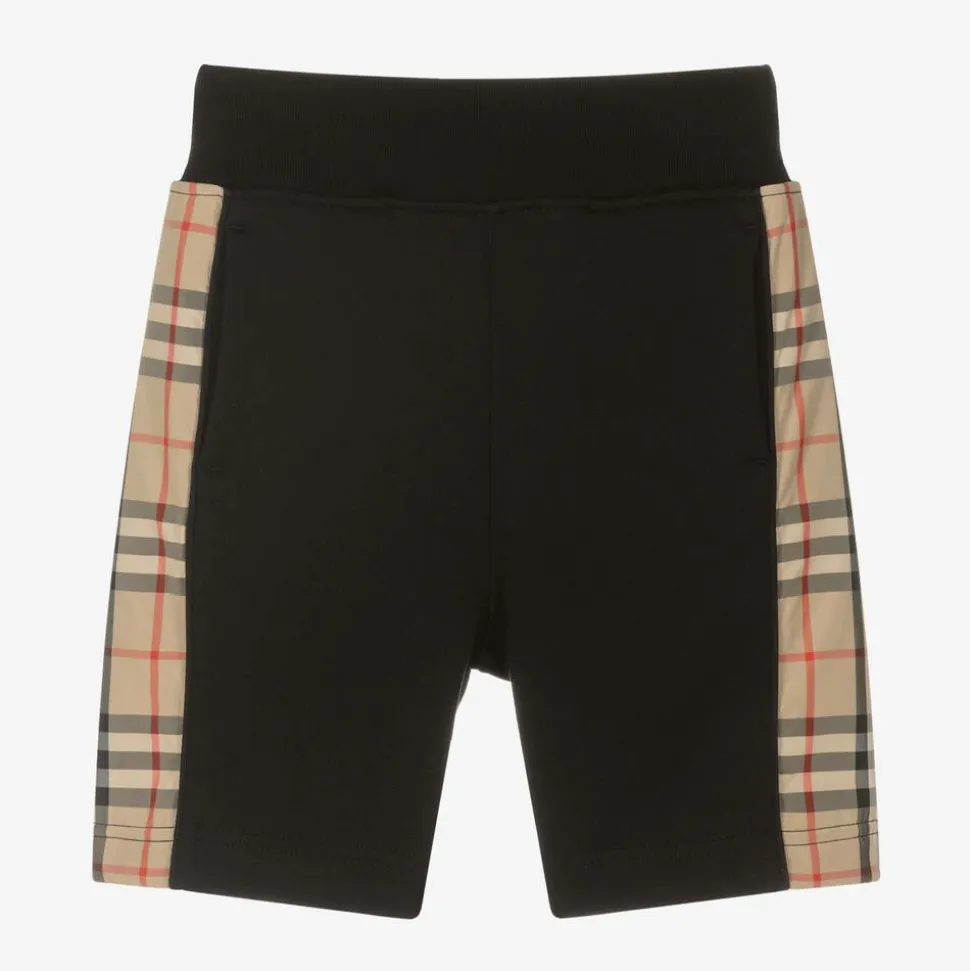 Cool black shorts for boys from British luxury brand Burberry, made in mid-weight cotton jersey. Unmistakeably Burberry, they have silky Vintage check trims on the sides. The elasticated waist has an internal drawstring for optimal comfort and an adjustable fit. They are finished with concealed front pockets.