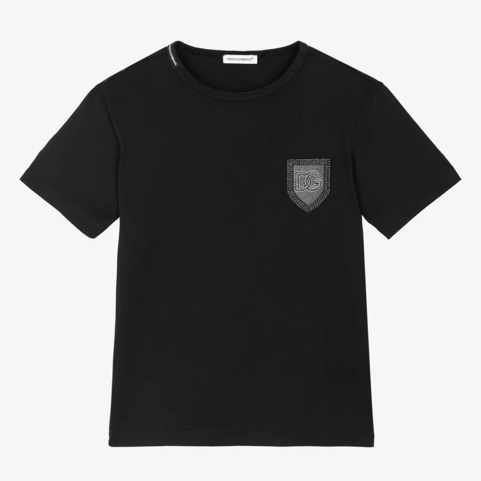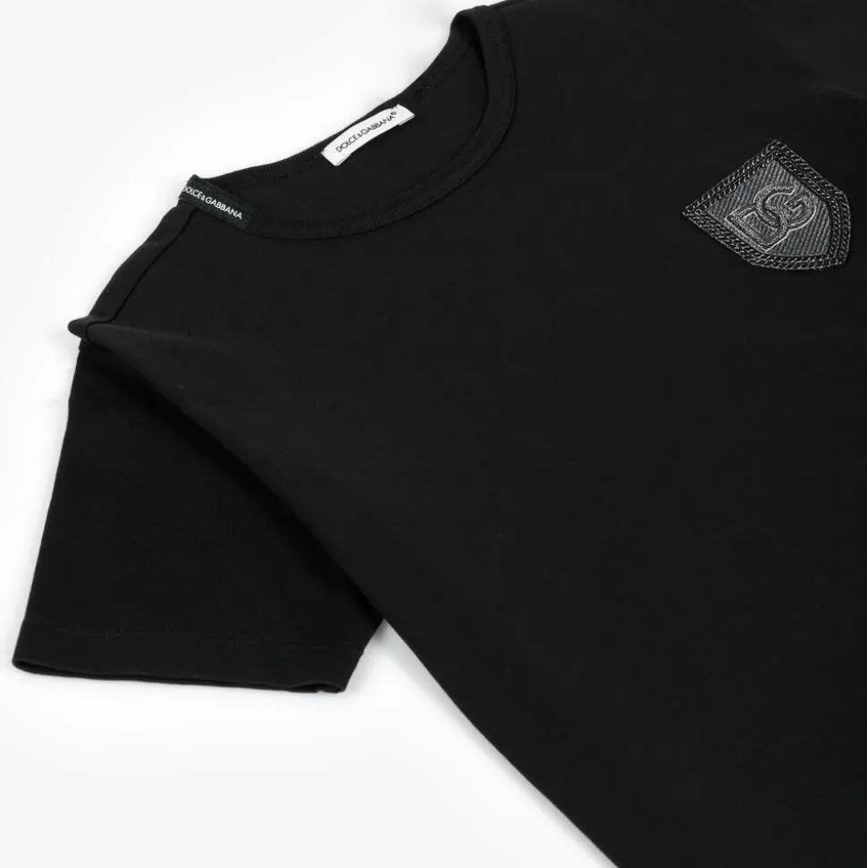 Black short-sleeved T-shirt for boys by luxury Italian brand Dolce & Gabbana. For instant brand recognition, it has a metallic silver DG logo crest appliquéd on the chest. This casual tee is made in comfortable cotton jersey, with a ribbed crew neckline.